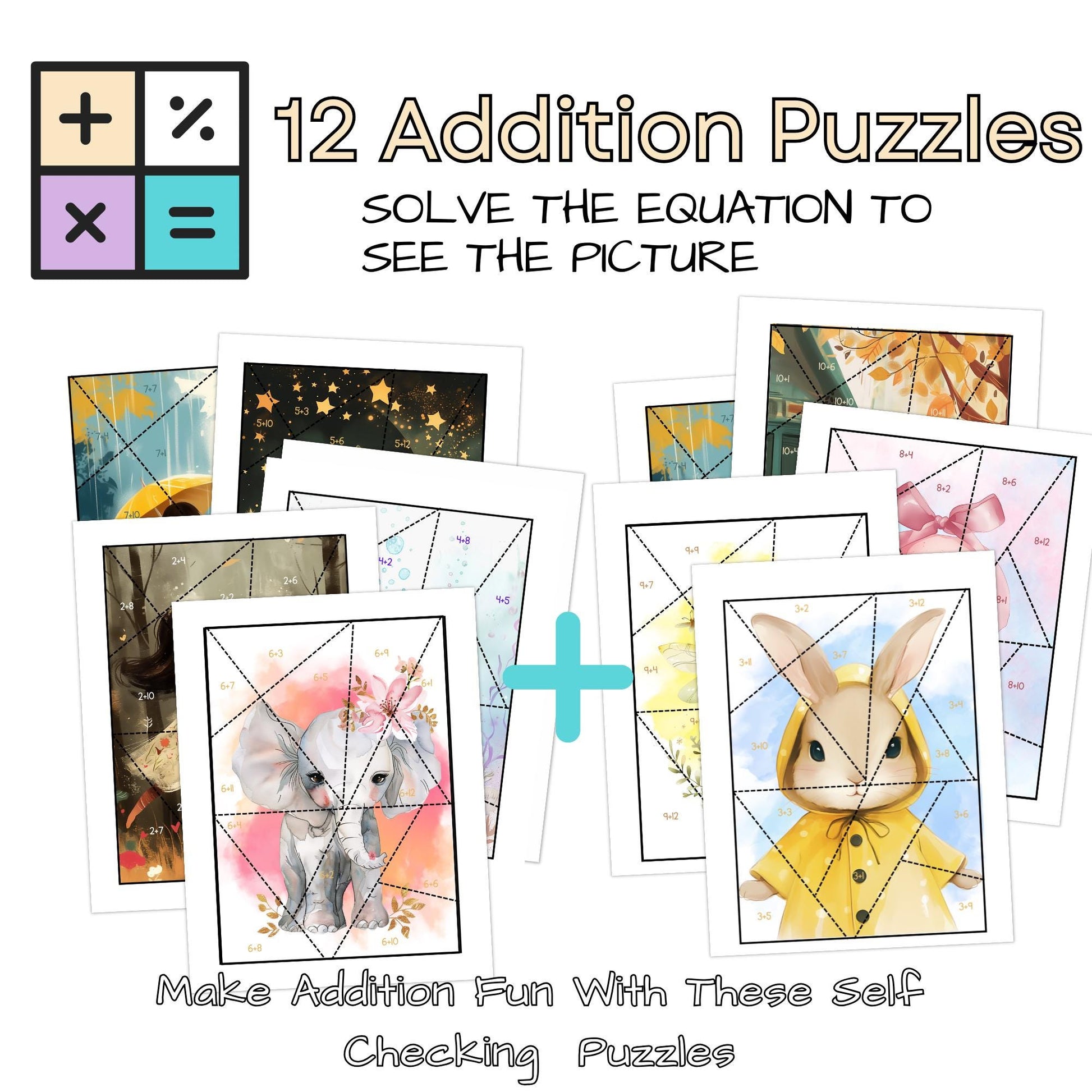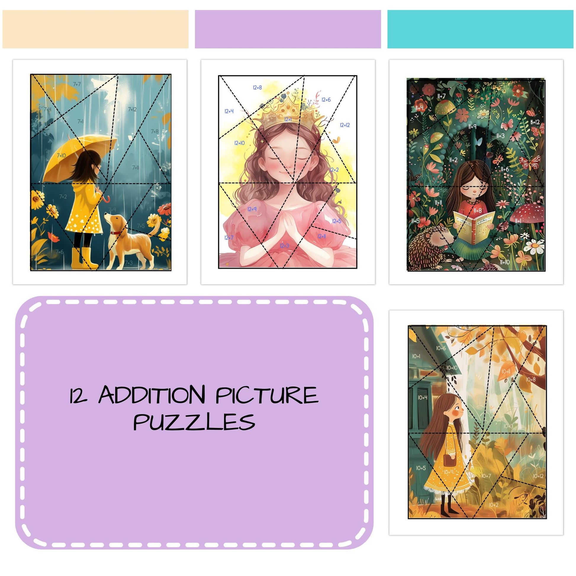 Addition Puzzles for Girls – Set of 12 Fun & Girly Math Activities (Facts 1–12)