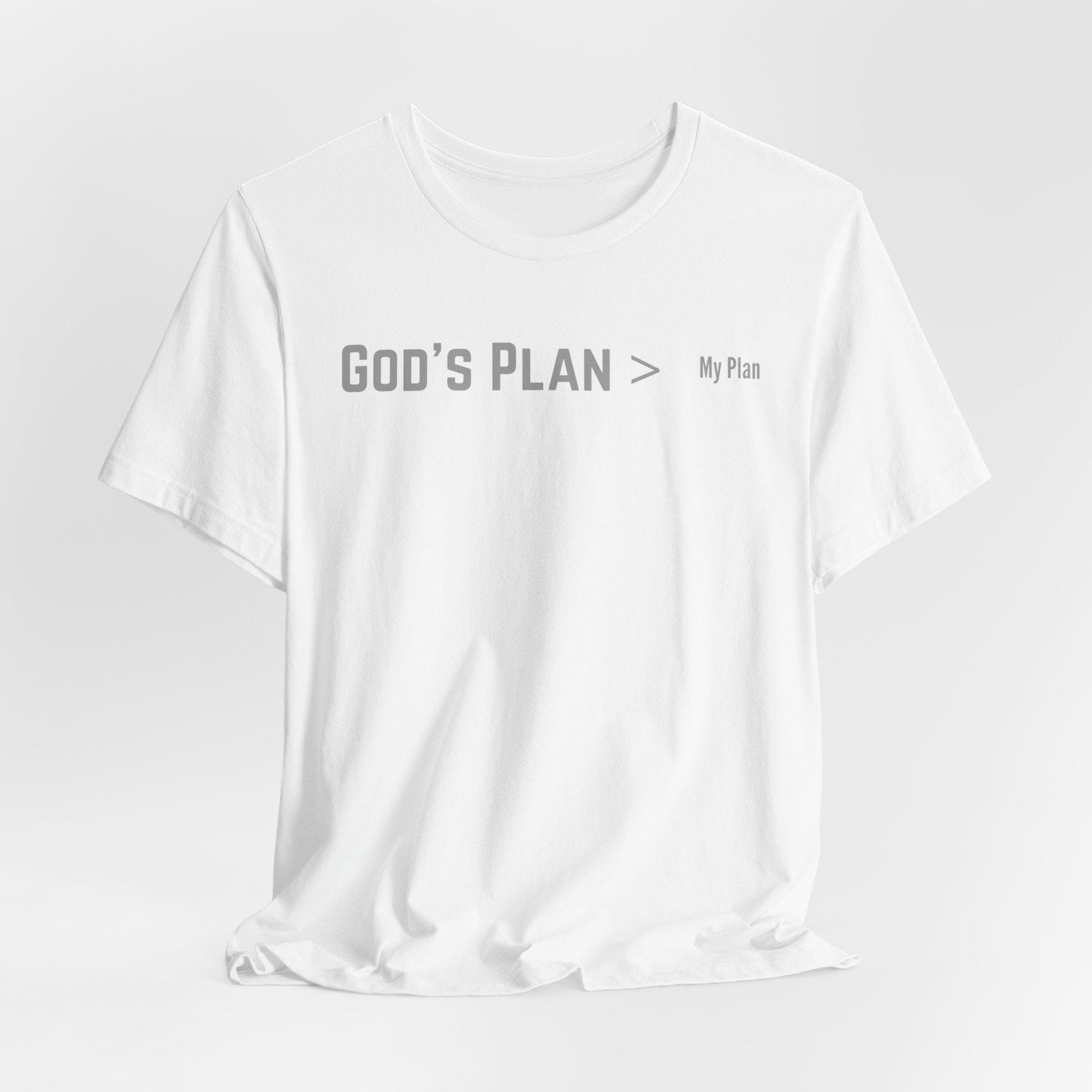 God's plan is greater than my plan. This classic jersey short sleeve tee fits like a well-loved favorite, and is the perfect gift for yourself or the believer in your life. Soft cotton and quality print make users fall in love with it over and over again. These t-shirts have-ribbed knit collars to bolster shaping. The shoulders are tapered for a better fit over time. Dual side seams hold the garment's shape for longer.