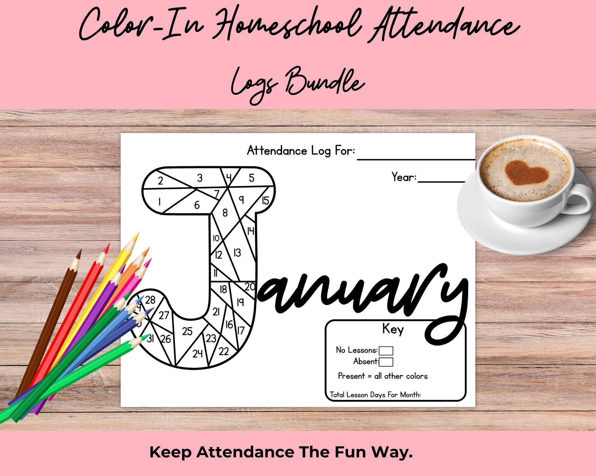Homeschool Attendance Color In Log | 13 Monthly Tracking Sheets | Printable PDF