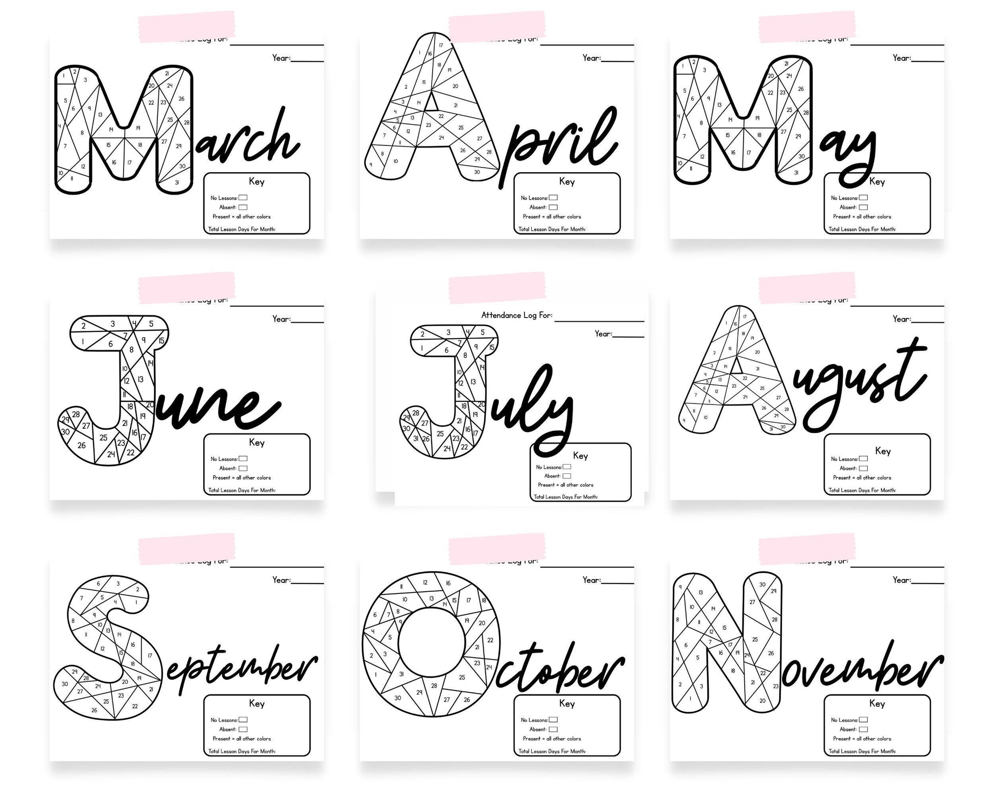 Parents or students can color in each day to track lesson days, non-lesson homeschool days, and absences using their own color code. A helpful key is included at the bottom of each sheet, along with a space to total up the number of days taught that month. Great for visual learners and record keeping, this is a fun and flexible way to document your homeschool year!