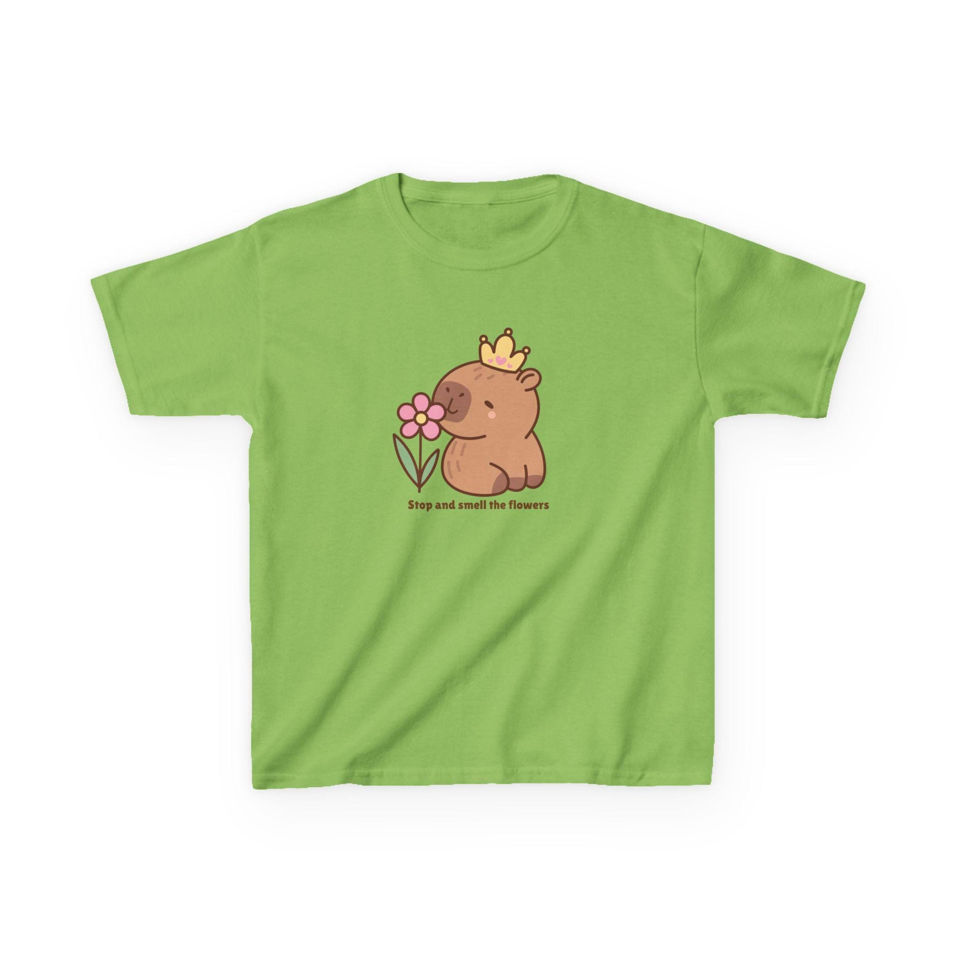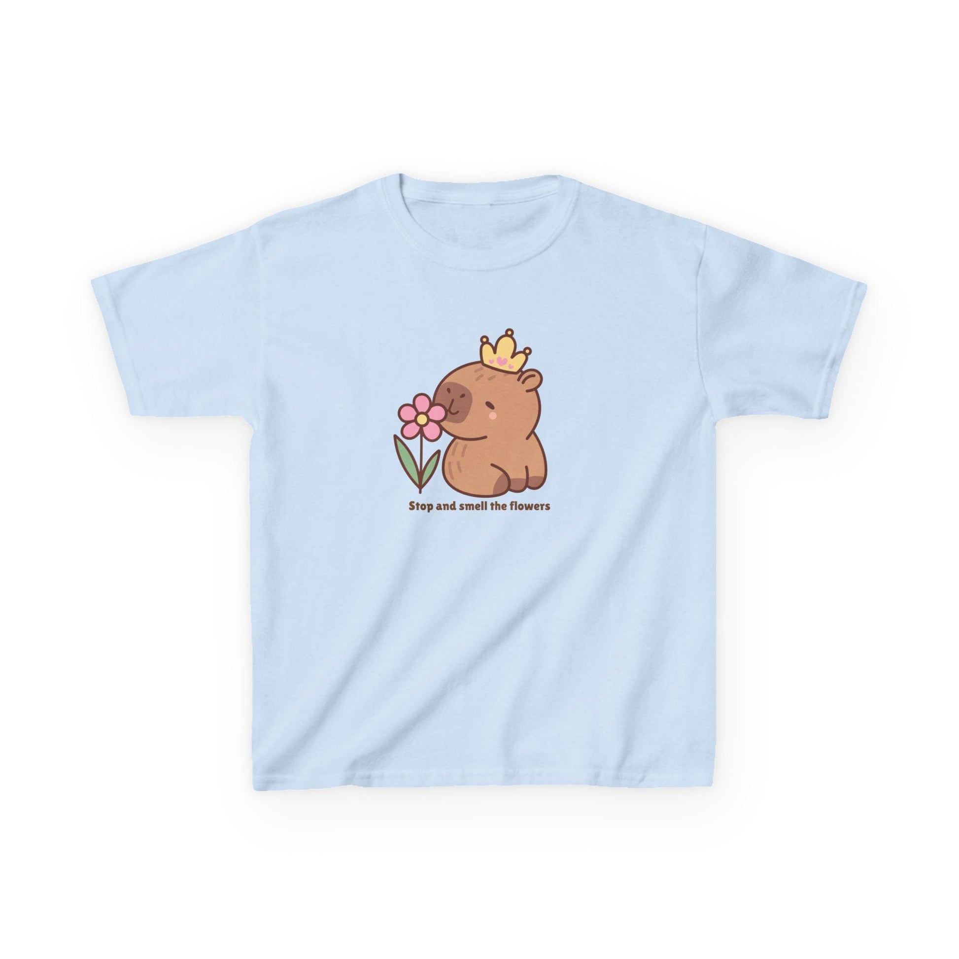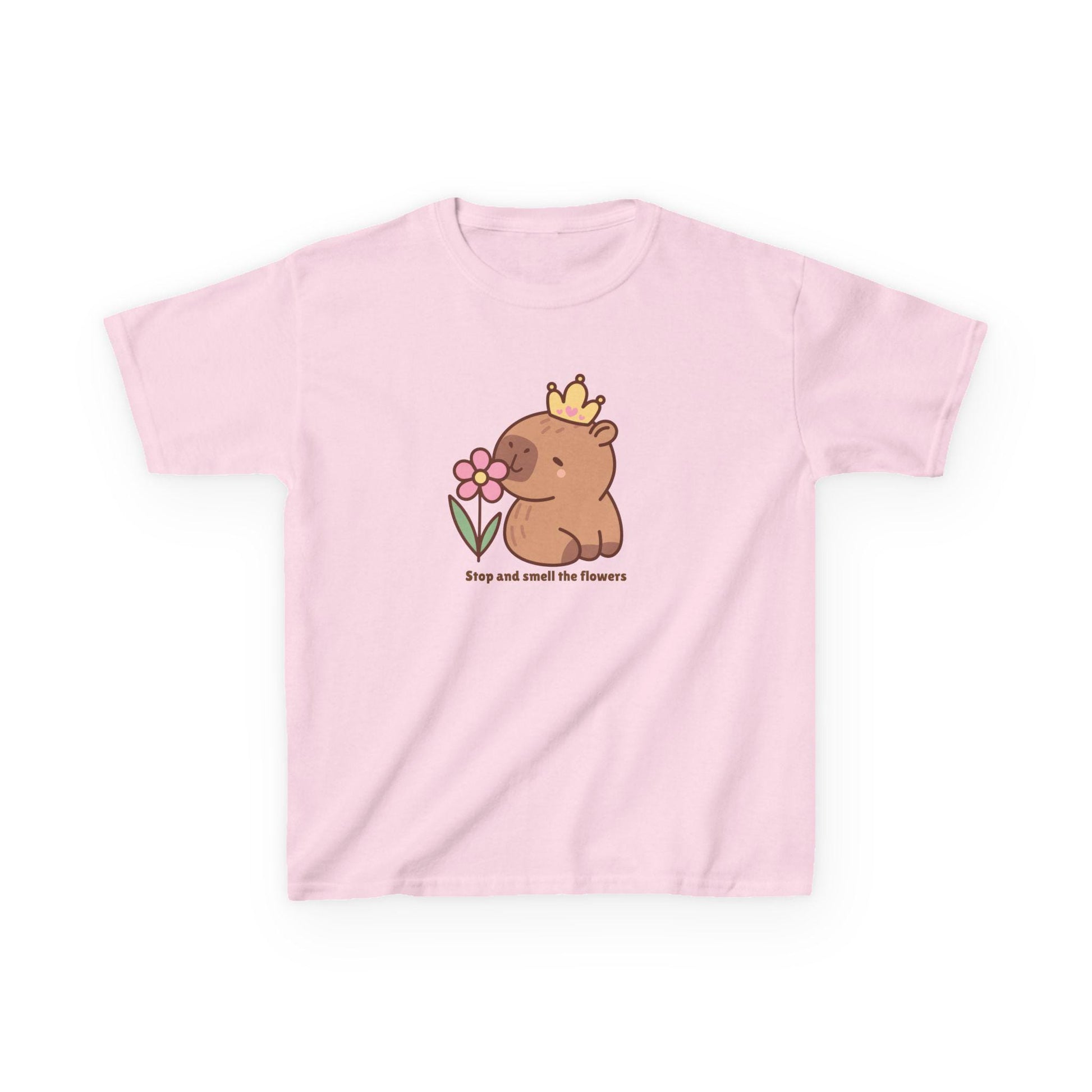 This sweet and whimsical "Stop and smell the flowers" tee features a cute capybara in a crown. It's perfect for playdates and everyday wear for your little princess. The fabric is 100% cotton for solid colors. Polyester is included for heather-color variants. These fabrics are prime materials for printing. The shoulders have twill tape for improved durability. The collar is curl resistant due to ribbed knitting. There are no seams along the sides.