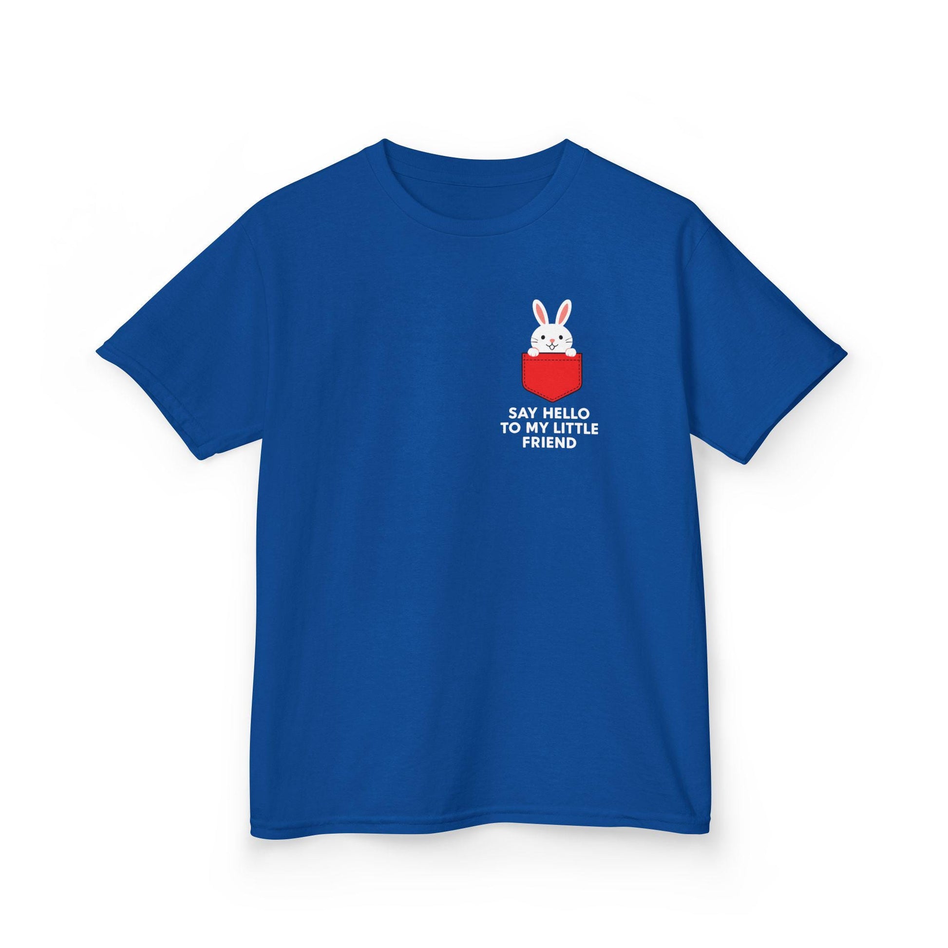 "Say Hello to My Little Friend," a playful and quirky tee featuring a tiny white rabbit in a faux red pocket, giving off a whimsical and fun vibe. Perfect for animal lovers and those who enjoy cute and unique designs. The kids heavy cotton tee is ideal for everyday use. The fabric is 100% cotton for solid colors. Polyester is included for heather-color variants. These fabrics are prime materials for printing. The shoulders have twill tape for improved durability. The collar is curl resistant due to ribbed knitting. There are no seams along the sides.