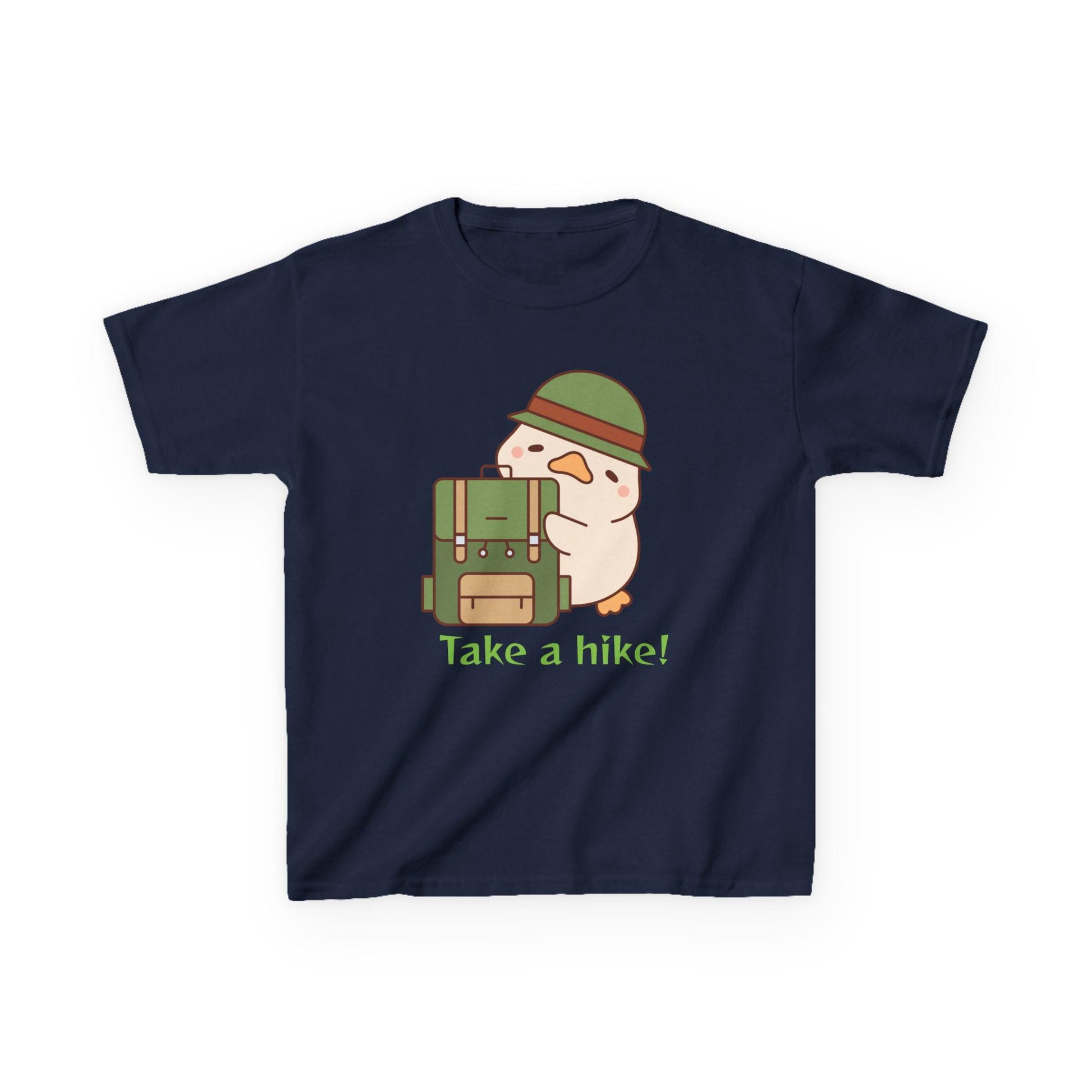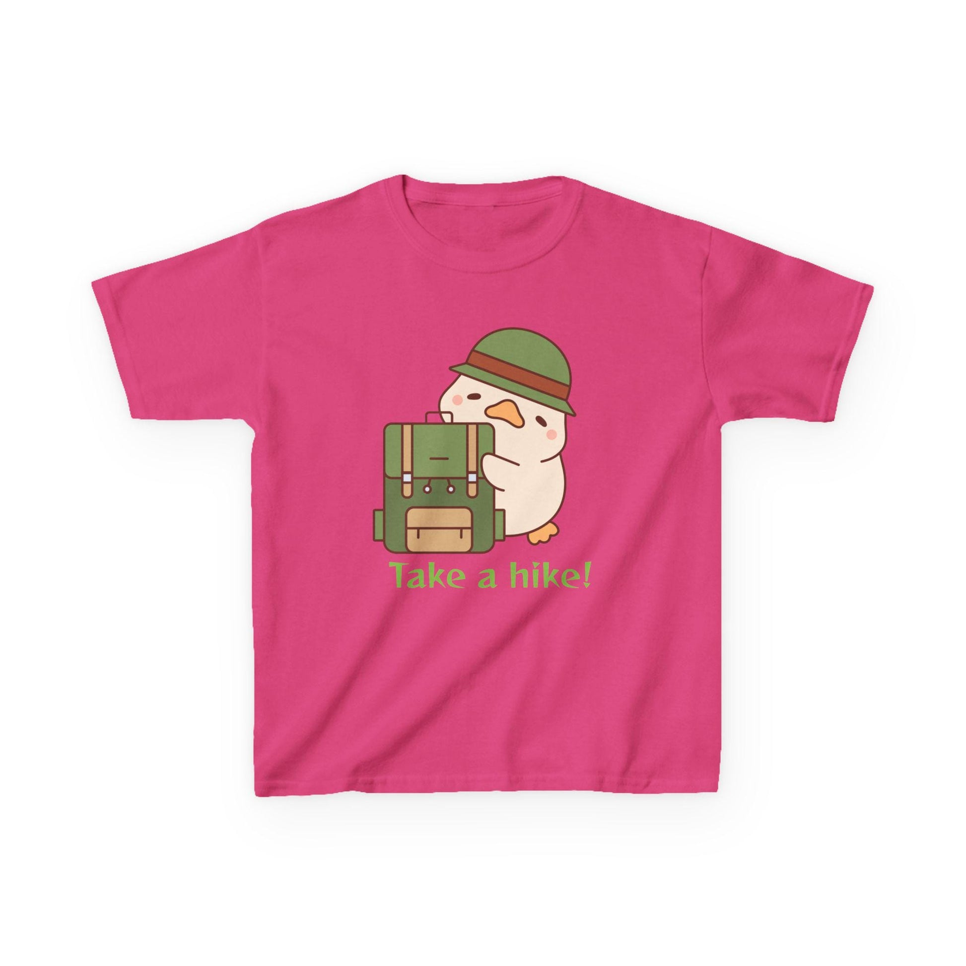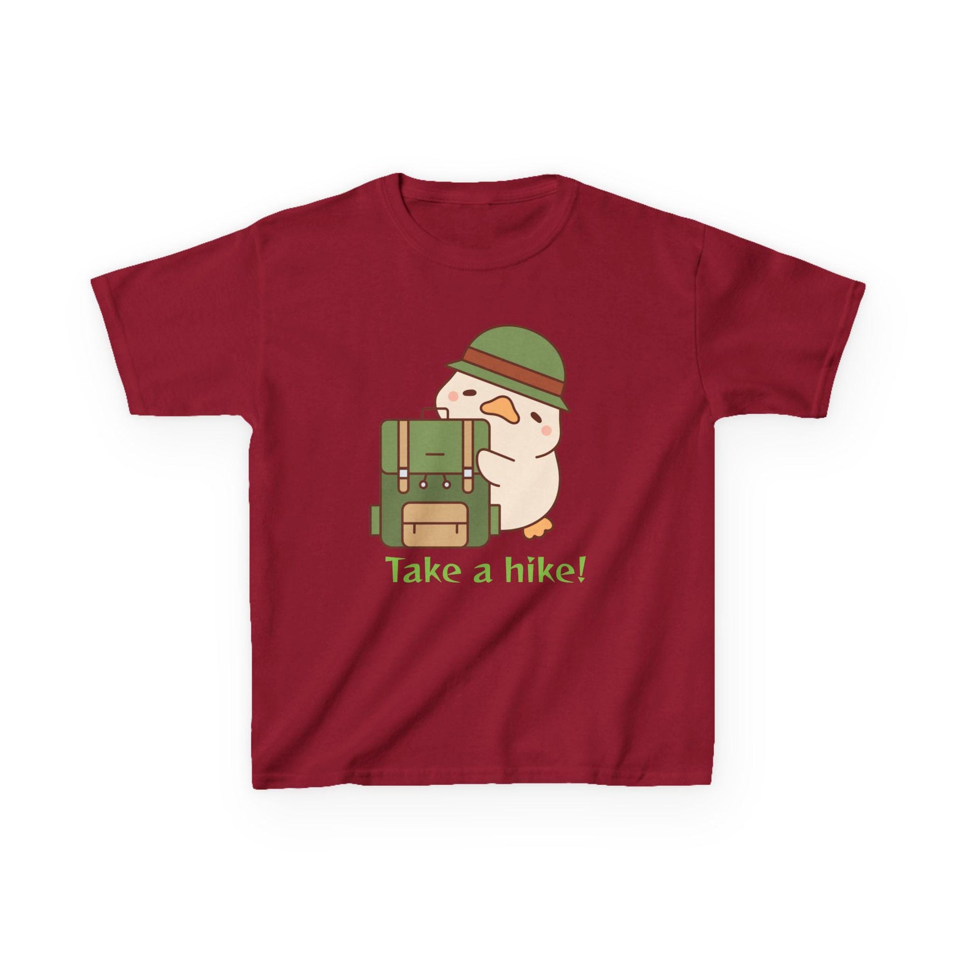 The kids "Take a Hike" heavy cotton tee features a cute backpacking duck and is perfect for the trail, camping, or everyday use. It will quickly become one of your little adventurer's new favorites. The fabric is 100% cotton for solid colors. Polyester is included for heather-color variants. These fabrics are prime materials for printing. The shoulders have twill tape for improved durability. The collar is curl resistant due to ribbed knitting. There are no seams along the sides. .: Made with 100%, midweight (5.3 oz/yd² (180 g/m²)), US cotton that feels soft to the touch and a great choice for any season. .: The crew neckline along with the tee's classic fit, deliver a timeless style that is perfect for daily use. .: All t-shirts come with pearlized, tear-away labels for total comfort and a scratch-free experience. .: Made using ethically grown and harvested US cotton. Gildan is also a proud member of the US Cotton Trust Protocol ensuring ethical and sustainable means of production. This blank tee is certified by Oeko-Tex for safety and quality assurance. .: Fabric blends: Heather colors - 50% cotton, 50% polyester, Sport Grey - 90% cotton, 10% polyester, Ash - 99% cotton, 1% polyester.