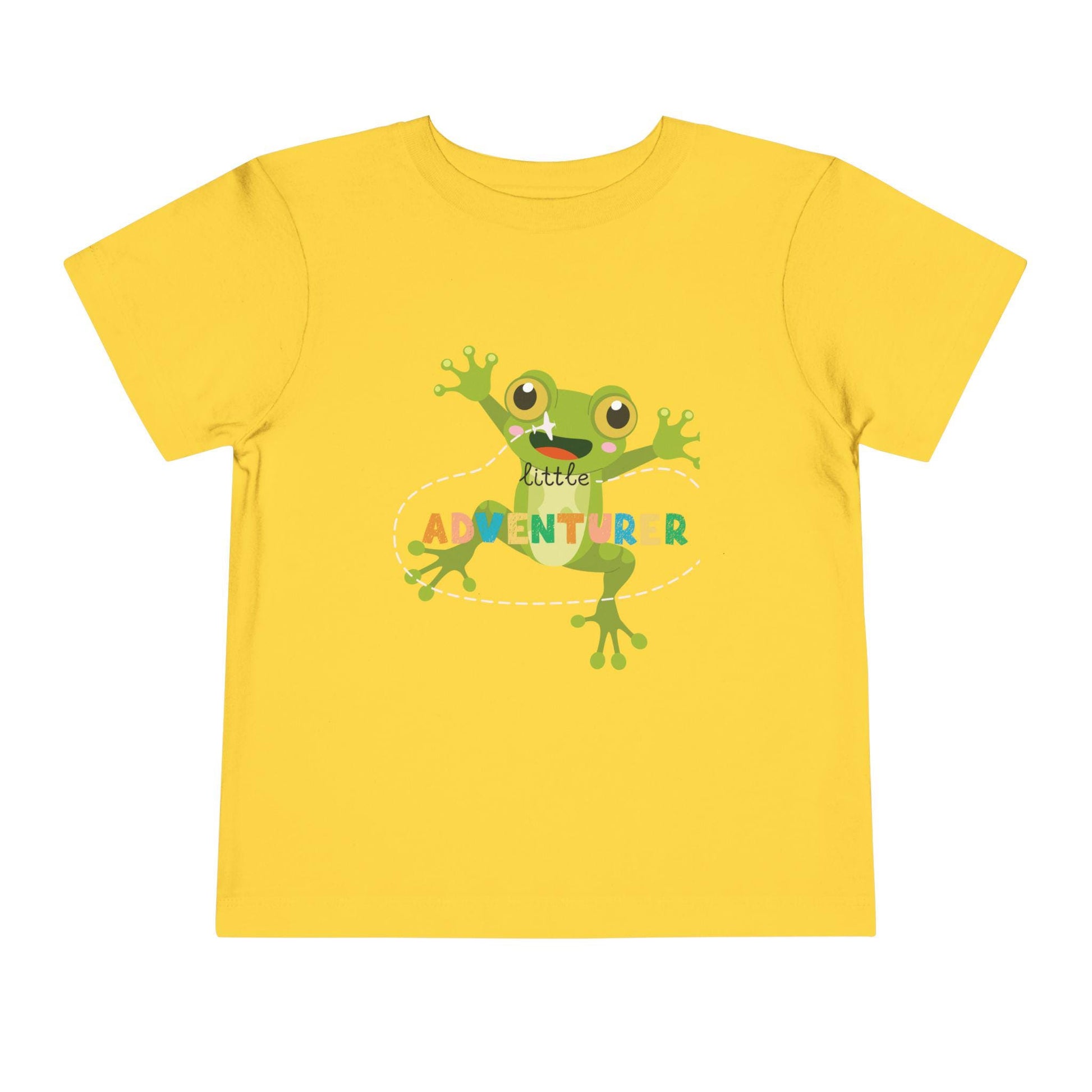 Uplift any child's wardrobe with this "Little Adventurer" toddler t-shirt featuring a happy, jumping frog. The Bella Canvas short sleeve tee for toddlers is a 100% Airlume combed and ring-spun cotton jersey with a tear-away label for extra comfort. Choose your favorite color out of a big variety, and make unique staples that toddlers will happily wear every day.