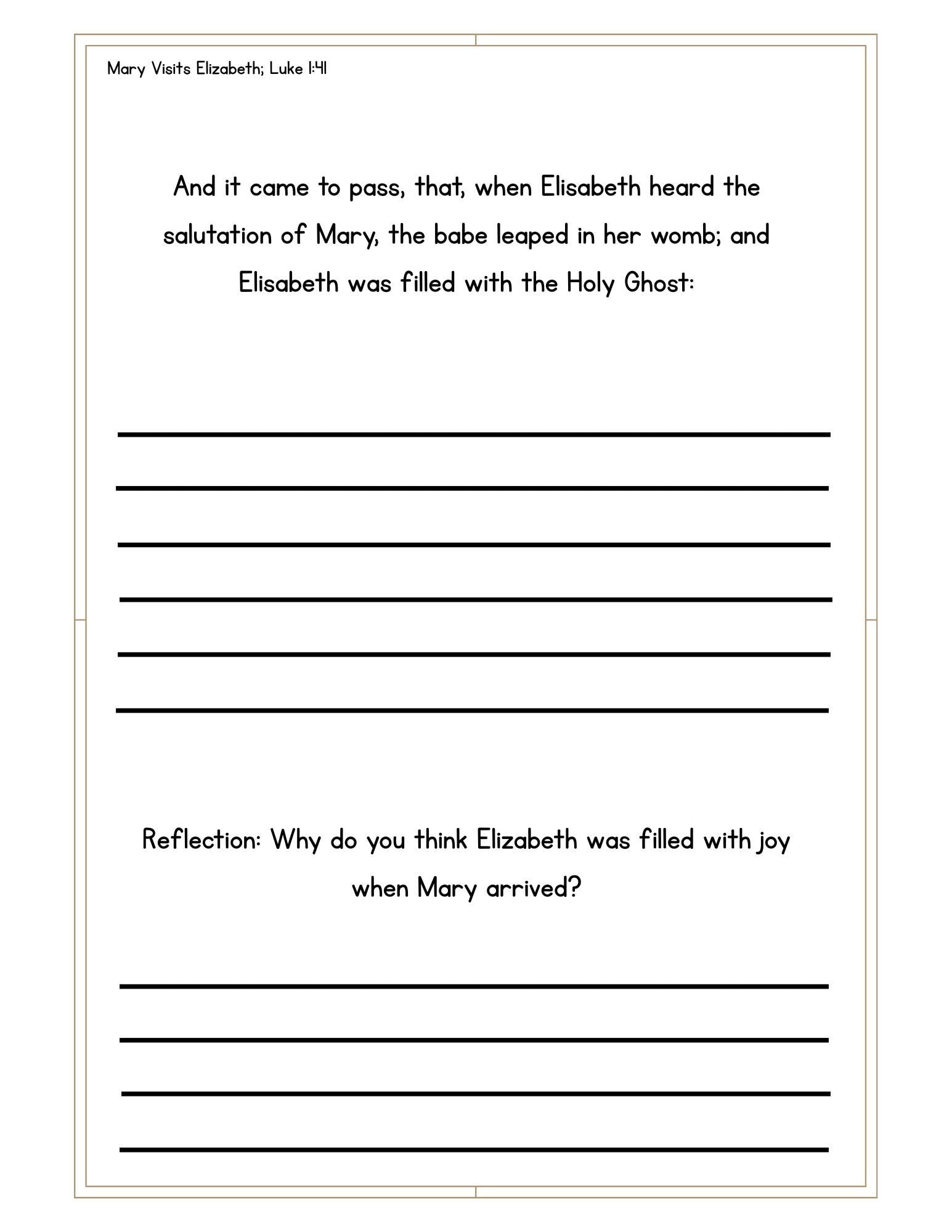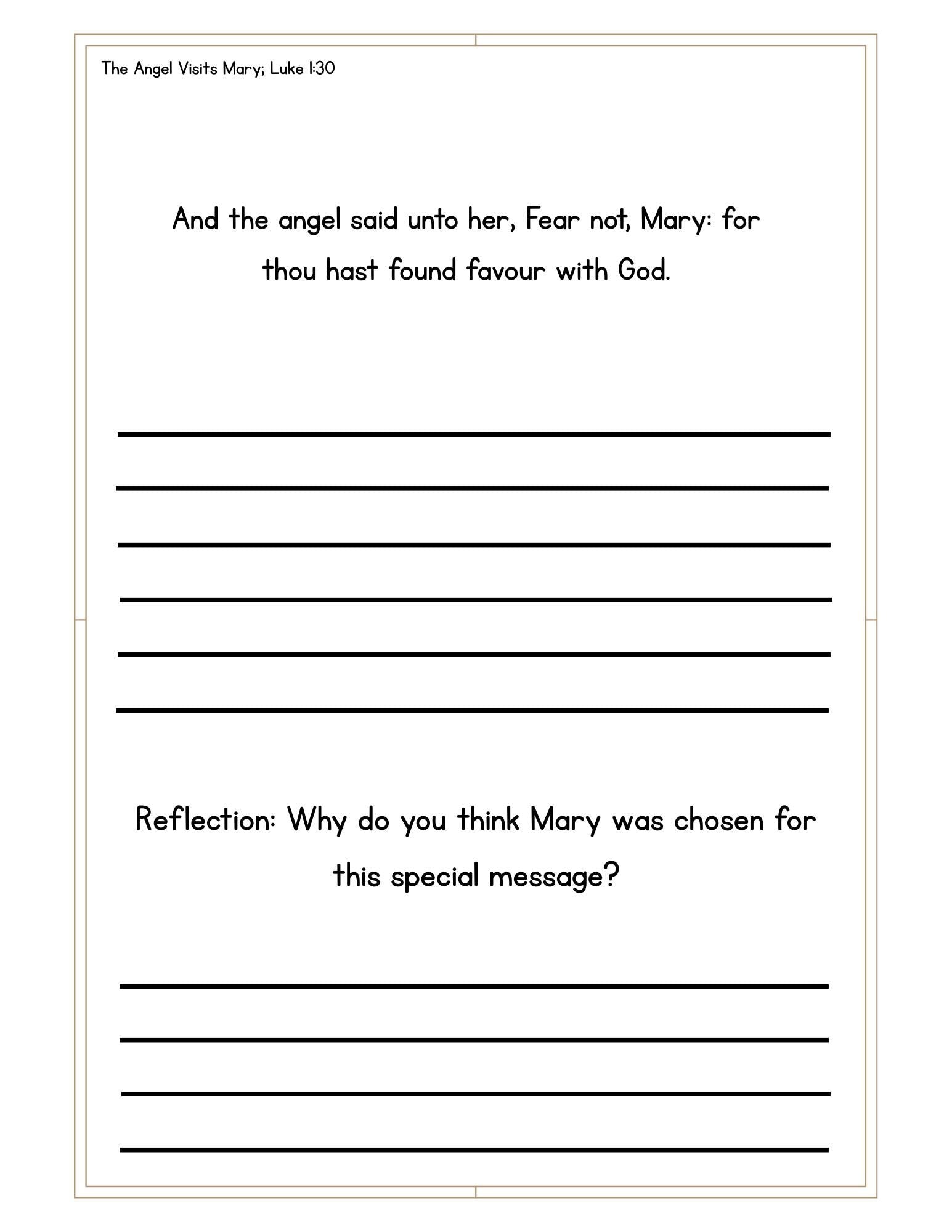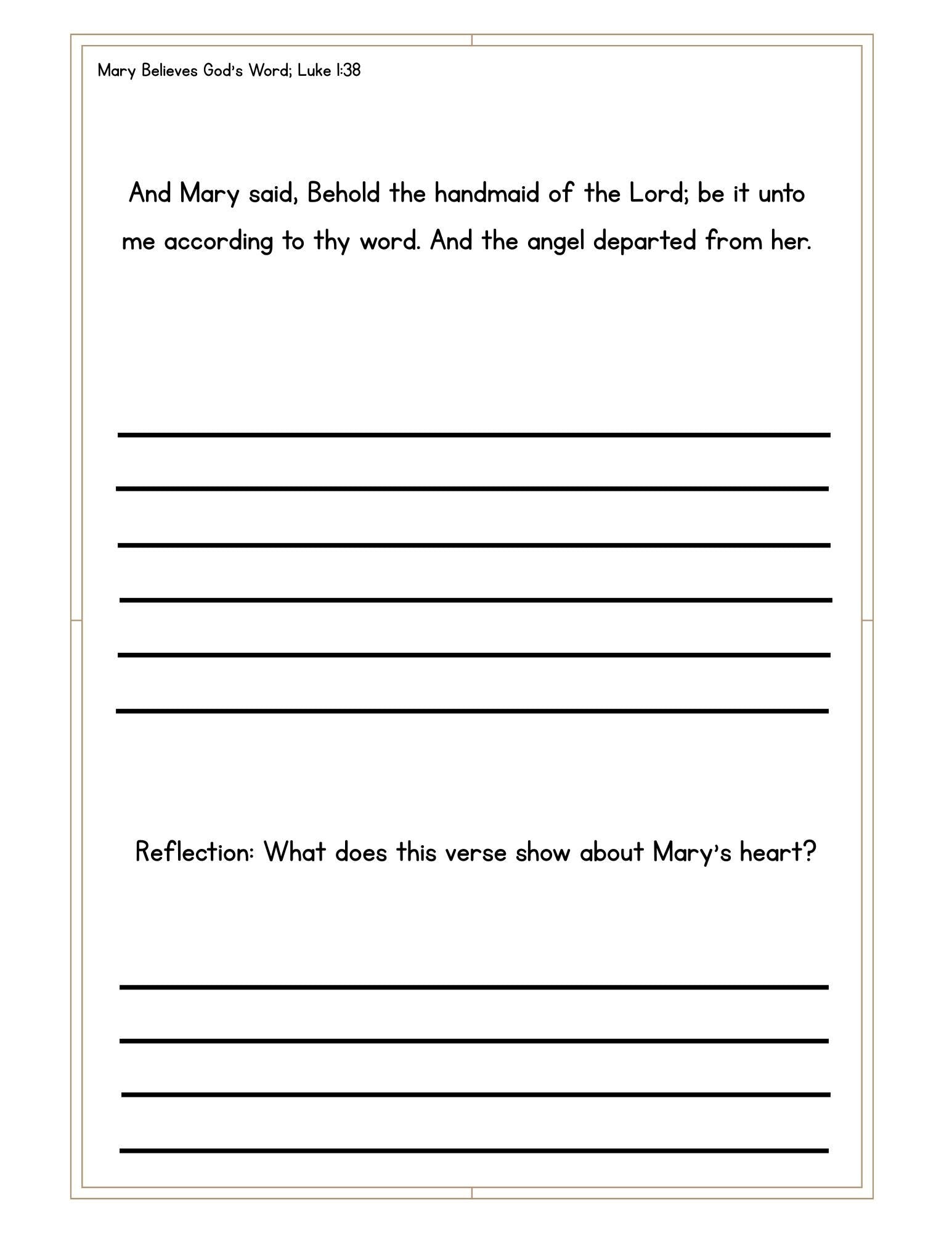 Each copywork page features a carefully selected Bible verse from Mary’s life, a scene title to help set the context (like “The Angel Visits Mary”), and an optional reflection question to encourage spiritual thinking. To help children understand what they are writing, this set also includes a Scripture guide written in simple, kid-friendly language that explains the meaning of each verse.