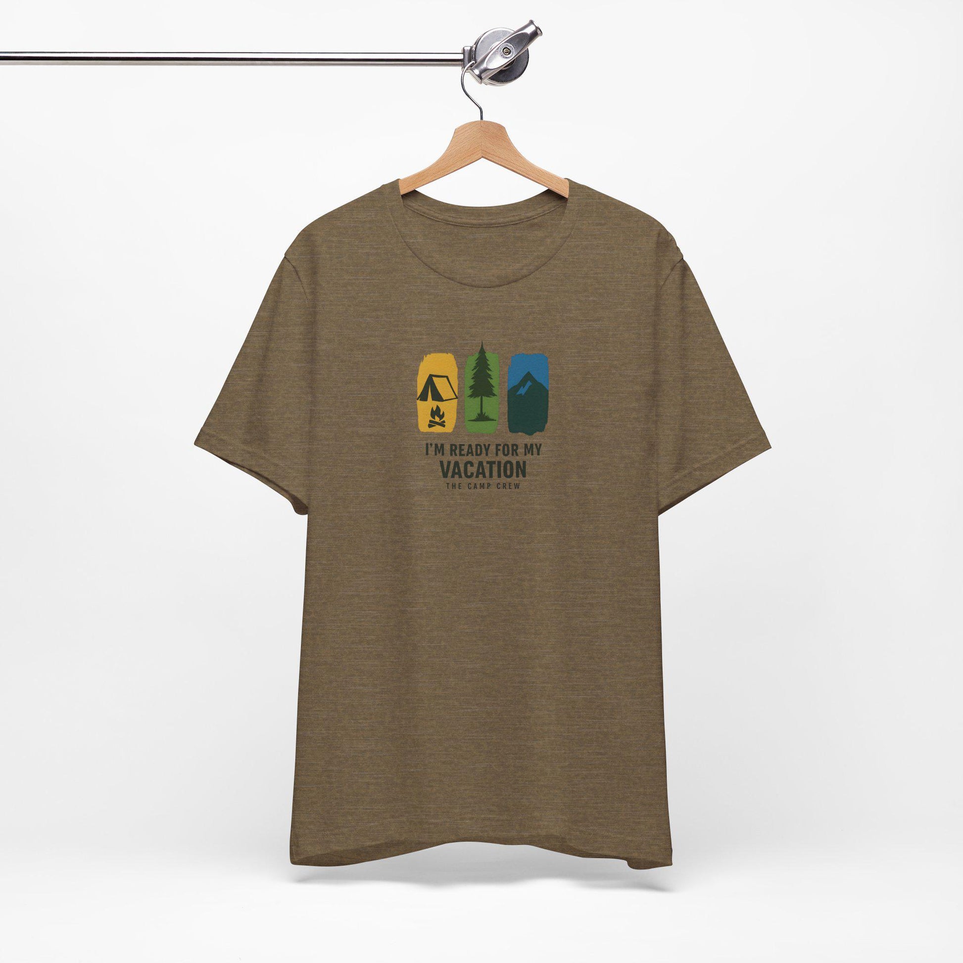 This "Ready for My Vacation, Camp Crew" tee is perfect for camping, hiking, and those who love spending time in the great outdoors. Ideal for your next adventure. This classic unisex jersey short sleeve tee fits like a well-loved favorite. Soft cotton and quality print make users fall in love with it over and over again. These t-shirts have-ribbed knit collars to bolster shaping. The shoulders are tapered for a better fit over time. Dual side seams hold the garment's shape for longer.