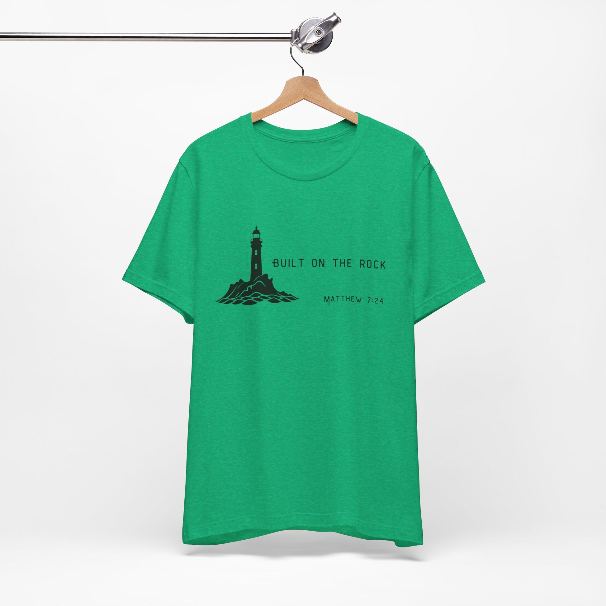 This "Built on the Rock" Matthew 7:24 tee featuring a lighthouse silhouette fits like a well-loved favorite. Soft cotton and quality print make users fall in love with it over and over again. These t-shirts have-ribbed knit collars to bolster shaping. The shoulders are tapered for a better fit over time. Dual side seams hold the garment's shape for longer.