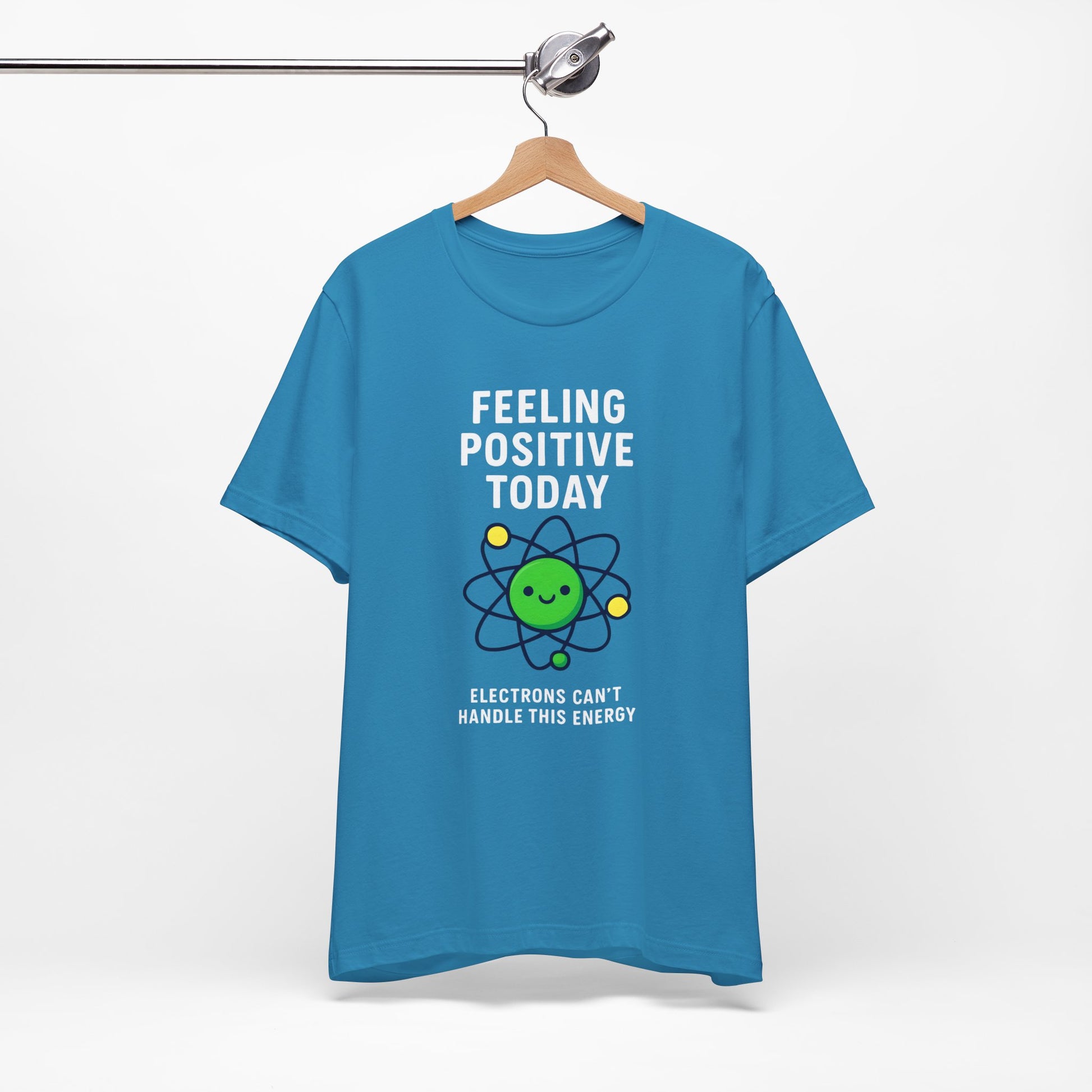 This quirky tee is perfect for the science lover in your life. It features a proton with the words "Feeling Positive Today... Electrons can't handle this energy." This classic unisex jersey short sleeve tee fits like a well-loved favorite. Soft cotton and quality print make users fall in love with it over and over again. These t-shirts have-ribbed knit collars to bolster shaping. The shoulders are tapered for a better fit over time. Dual side seams hold the garment's shape for longer.