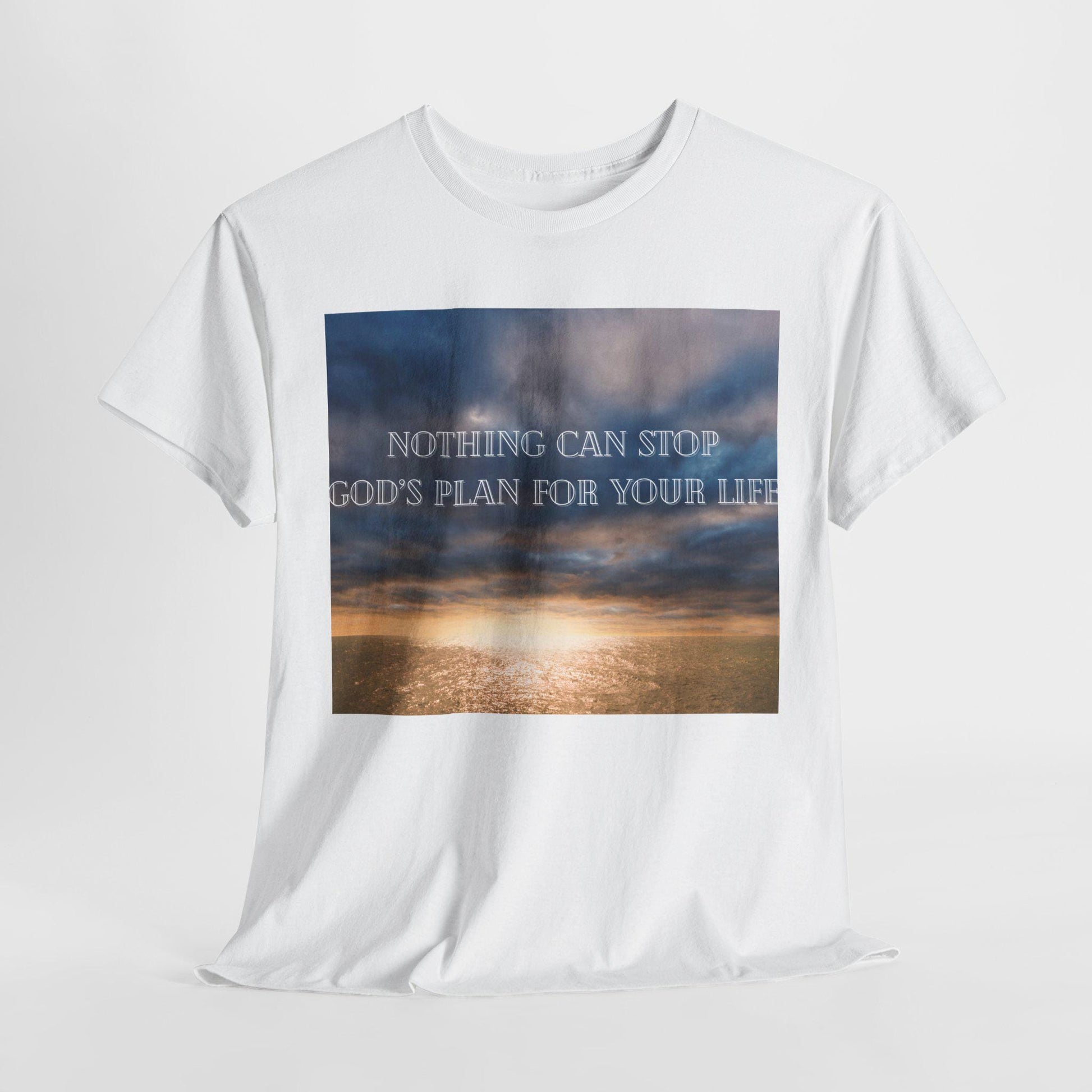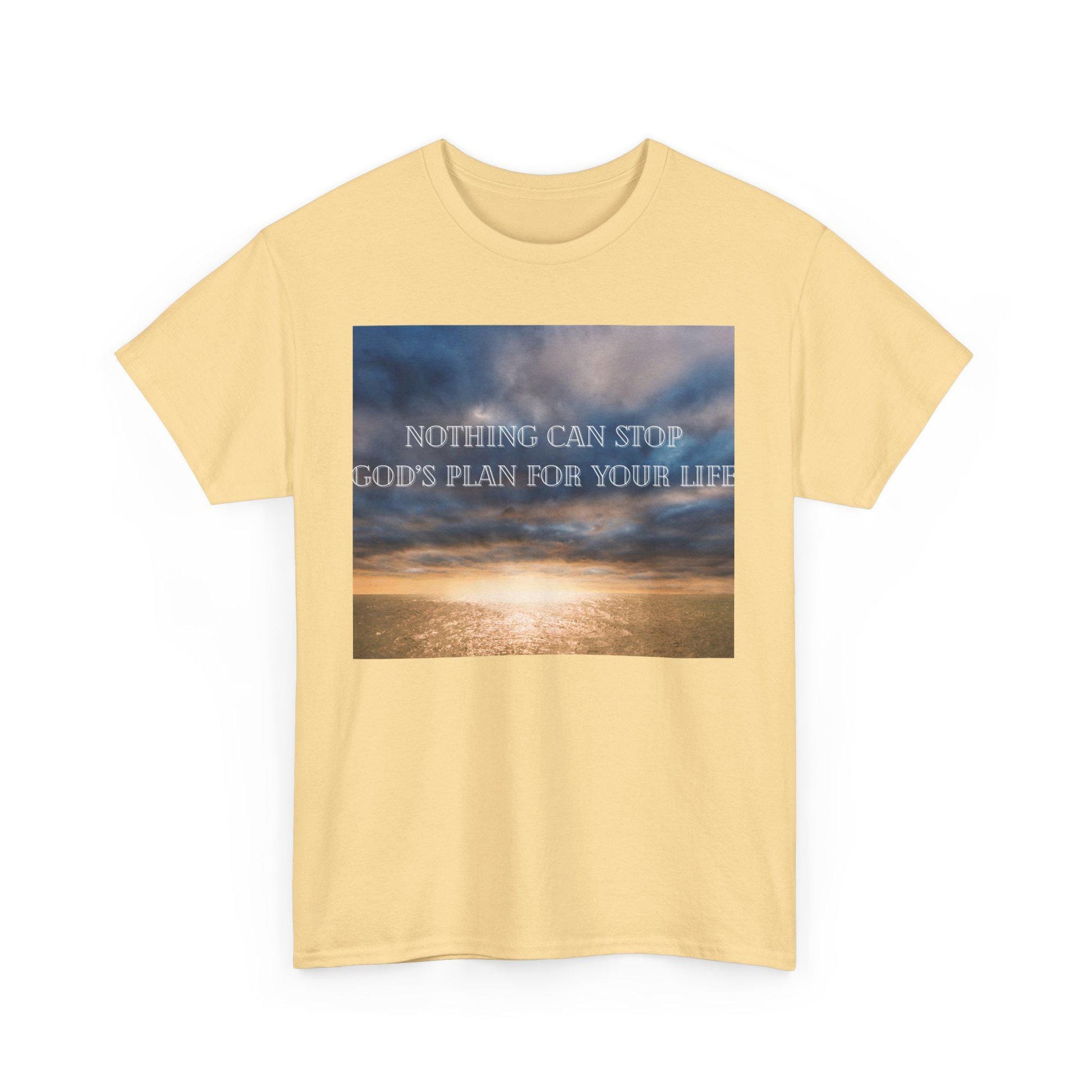 This "Nothing Can Stop God's Plan for Your Life" heavy cotton tee features a striking sky and sun shining over the water. Available in 8 colors and 8 sizes. The specially spun fibers provide a smooth surface for premium printing vividity and sharpness. No side seams mean there are no itchy interruptions under the arms. The shoulders have tape for improved durability.