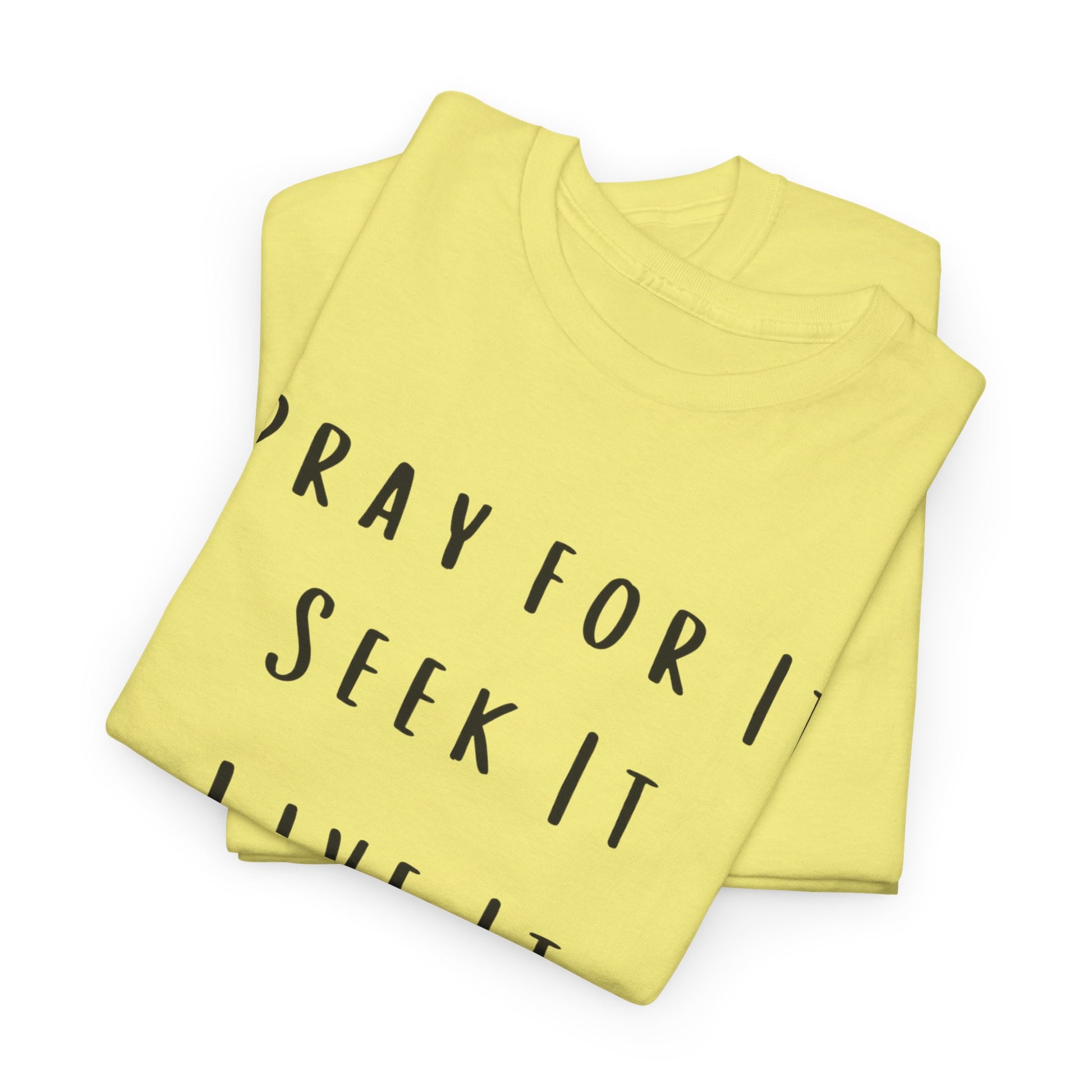 The Lord answers prayers. Show the world your faith with this "Pray for It, Seek It, Live It" Christian tee. It makes the perfect gift for the believer in your life. This heavy cotton tee is the basic staple of any wardrobe, and the foundation upon which casual fashion grows. The specially spun fibers provide a smooth surface for premium printing vividity and sharpness. No side seams mean there are no itchy interruptions under the arms. The shoulders have tape for improved durability.