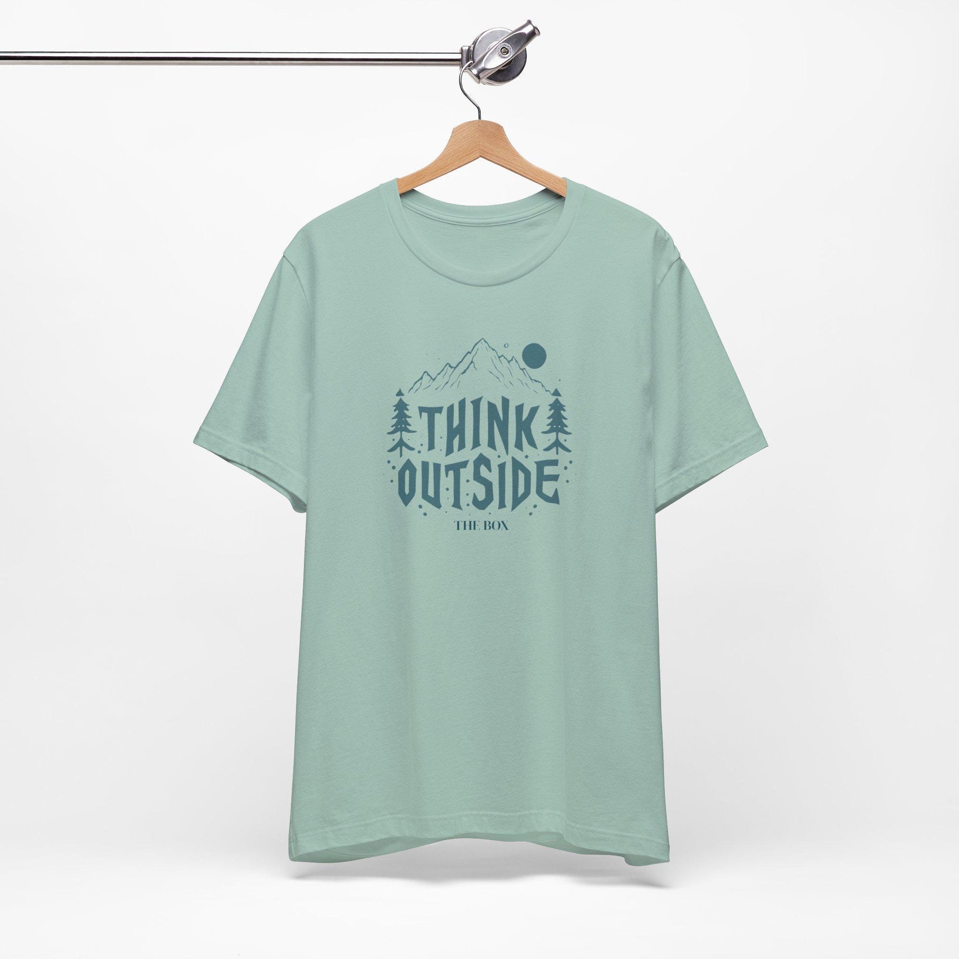 This "Think Outside the Box" classic jersey short sleeve tee features an inviting mountain scene and reminds us to enjoy the great outdoors. It fits like a well-loved favorite with soft cotton and quality print, users will fall in love with it over and over again. These t-shirts have-ribbed knit collars to bolster shaping. The shoulders are tapered for a better fit over time. Dual side seams hold the garment's shape for longer.