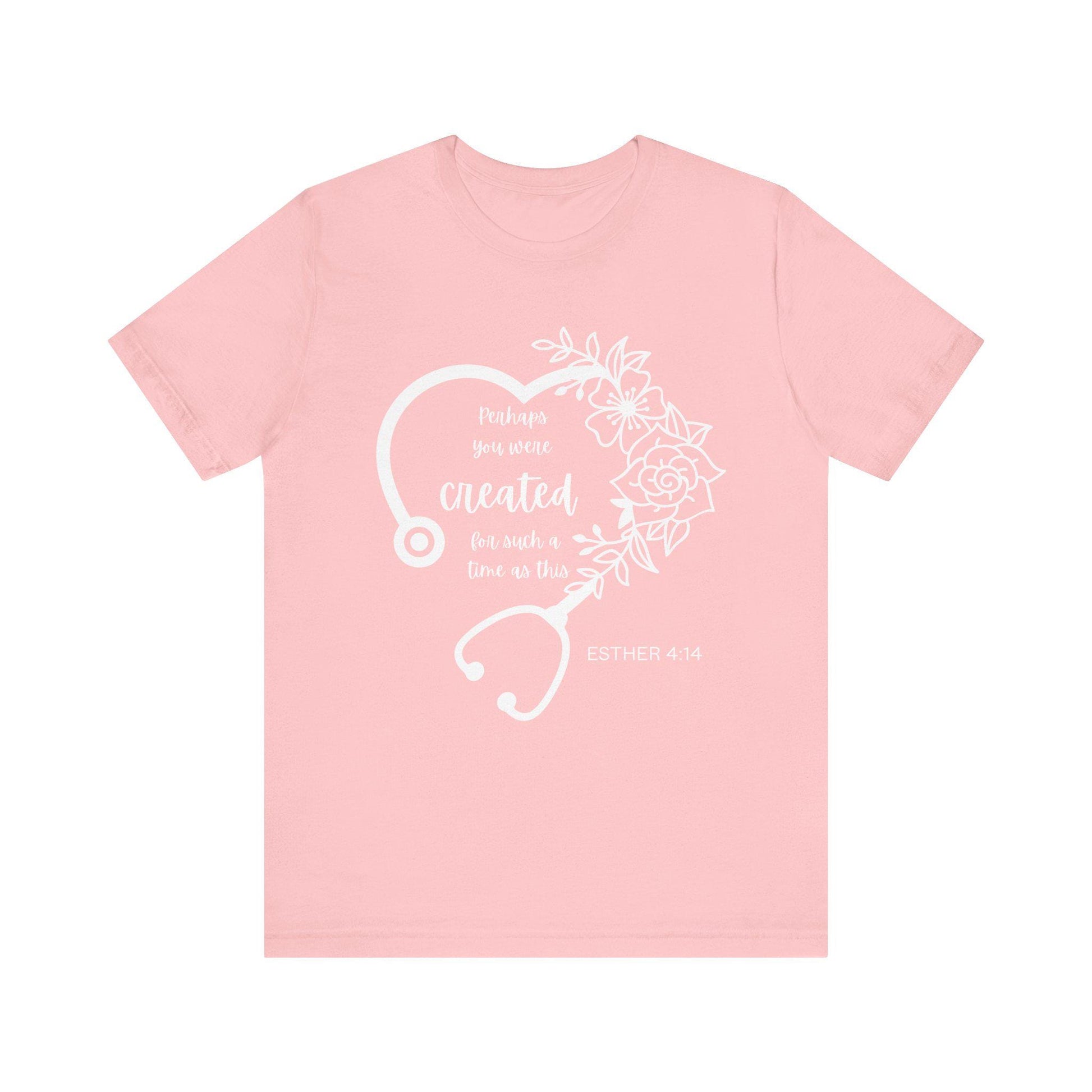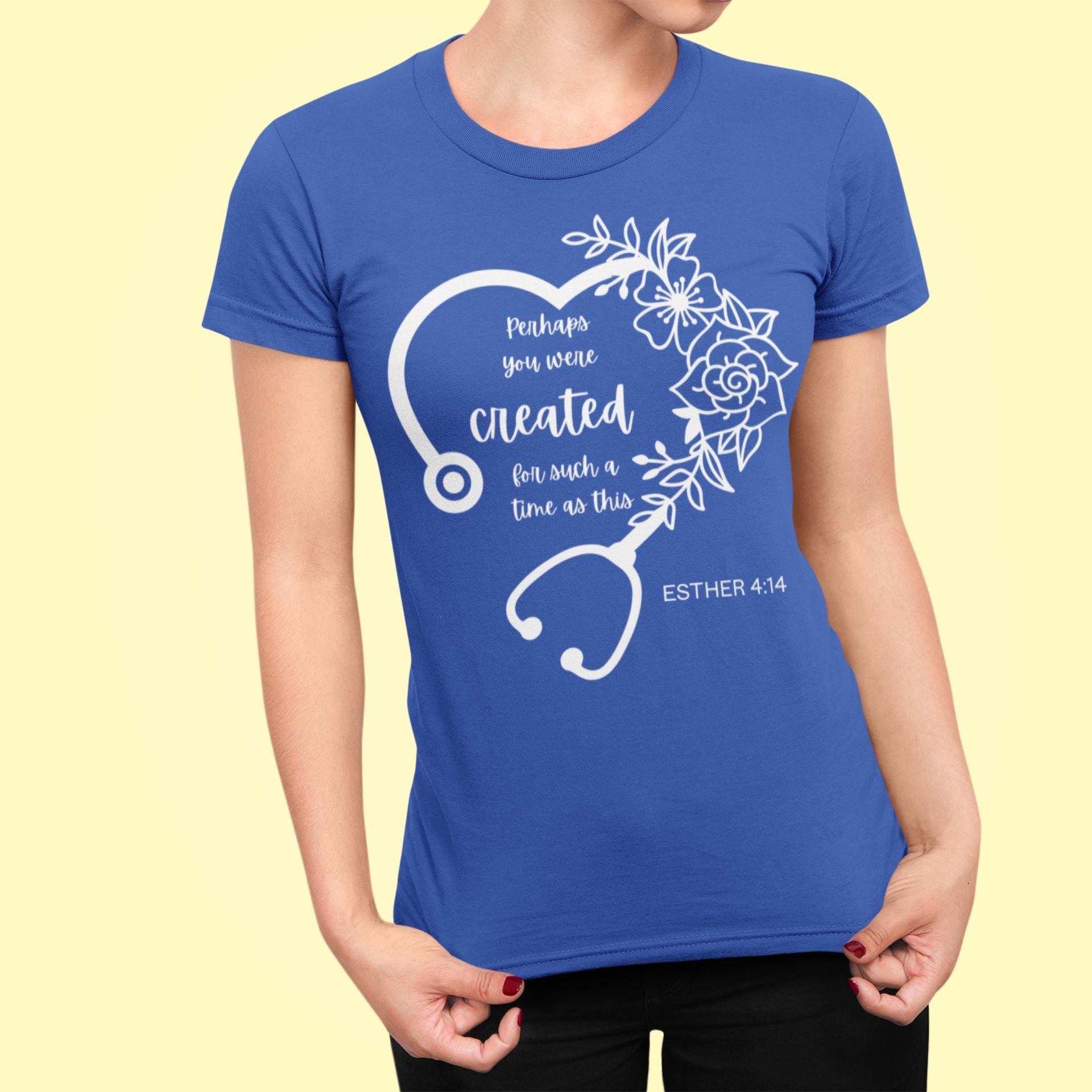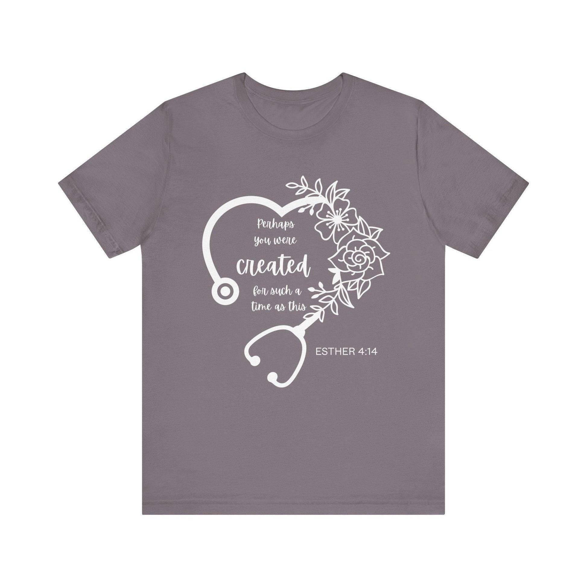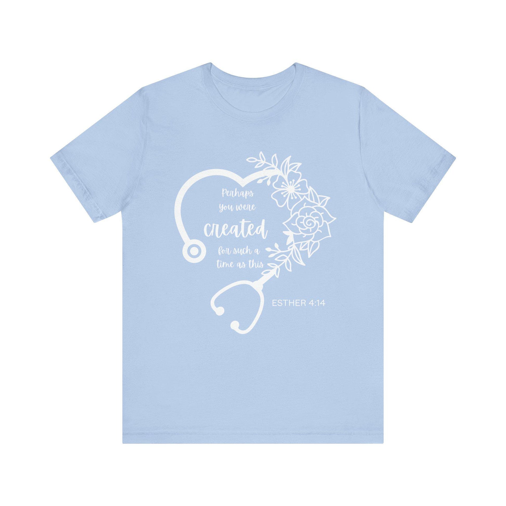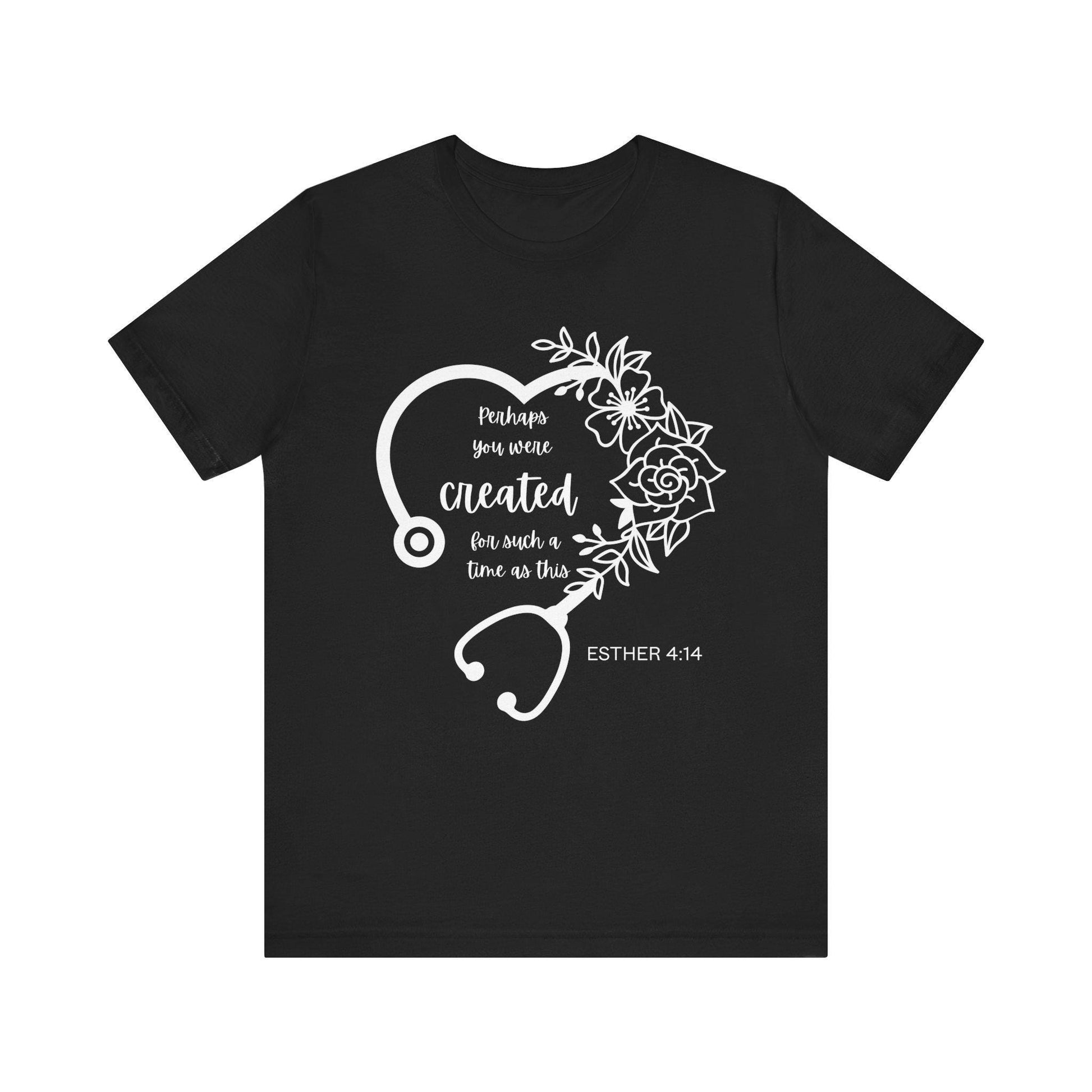 Celebrate the heart of a nurse with this beautifully designed t-shirt featuring a stethoscope in the shape of a heart, delicately adorned with floral outlines. Centered on the design is the inspiring Bible verse: "Perhaps you were created for such a time as this" — Esther 4:14. This shirt is perfect for nurses who serve with purpose and compassion. Made for comfort and encouragement, it’s a thoughtful gift for healthcare heroes or a meaningful piece for your own wardrobe.