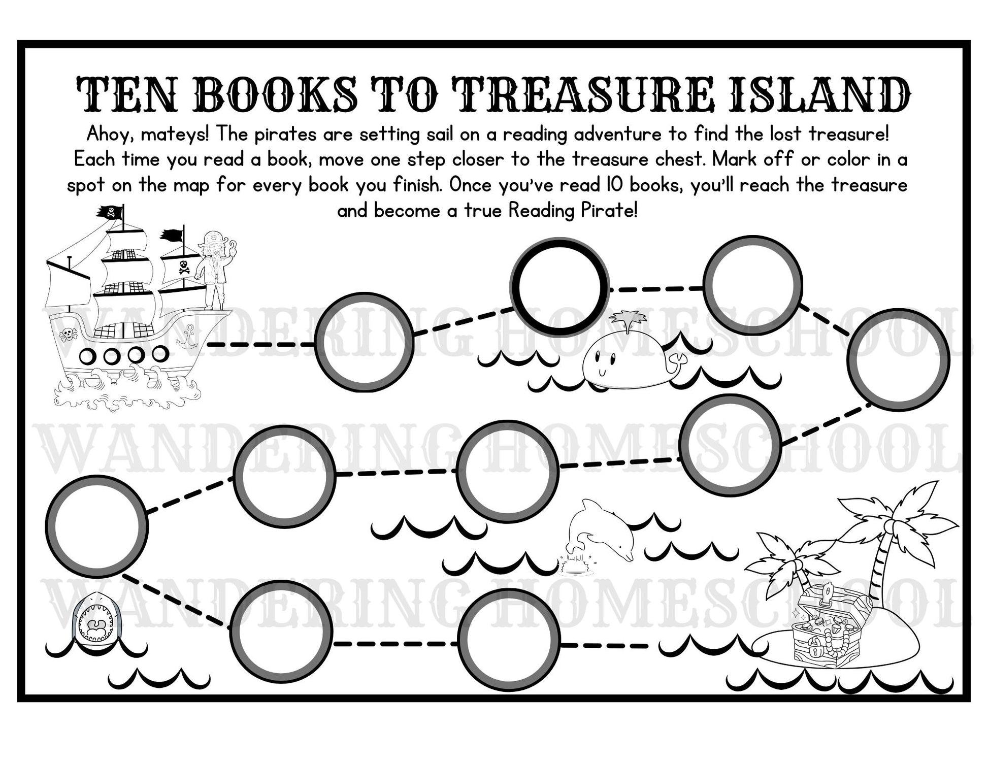 Ahoy, young readers! Set sail on a swashbuckling adventure with this pirate-themed reading reward chart. Children follow a 10-space treasure map, marking off each spot as they complete a book. With every book read, they move one step closer to the hidden treasure!