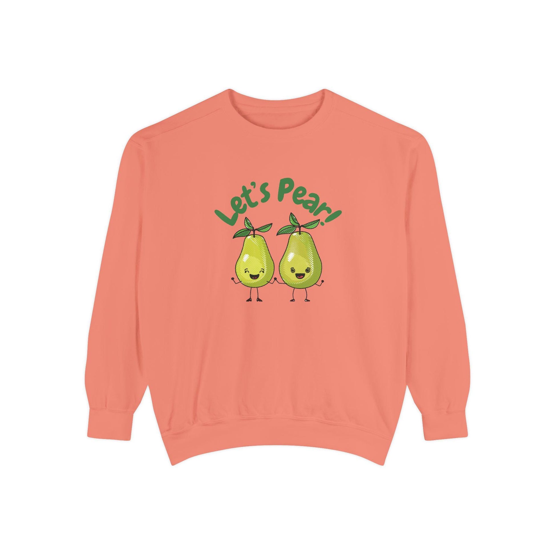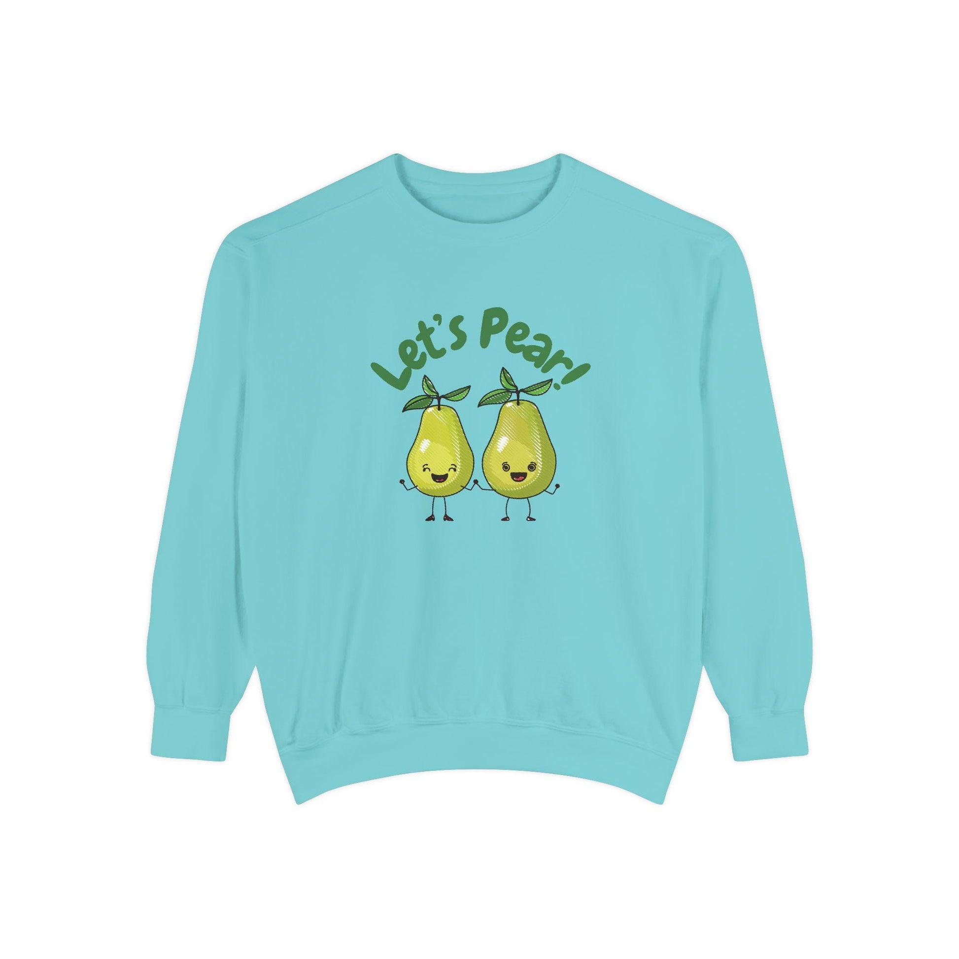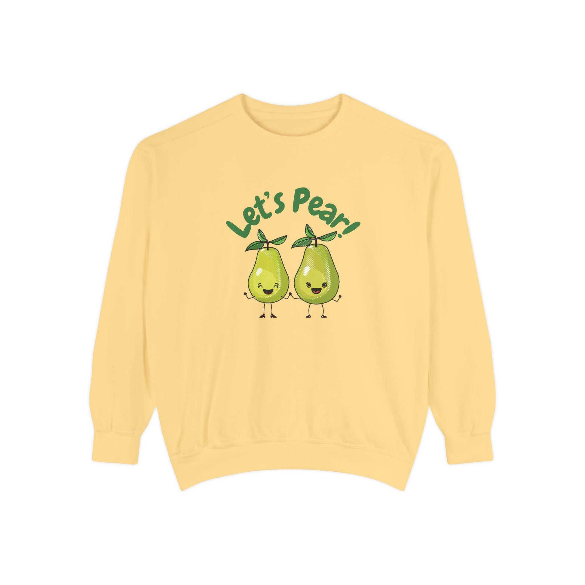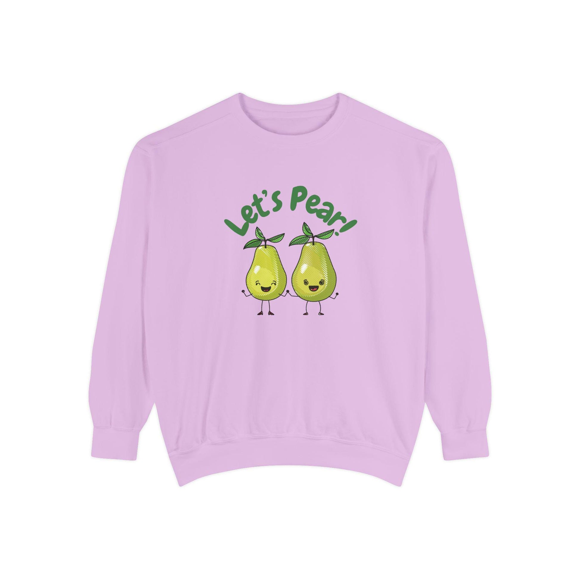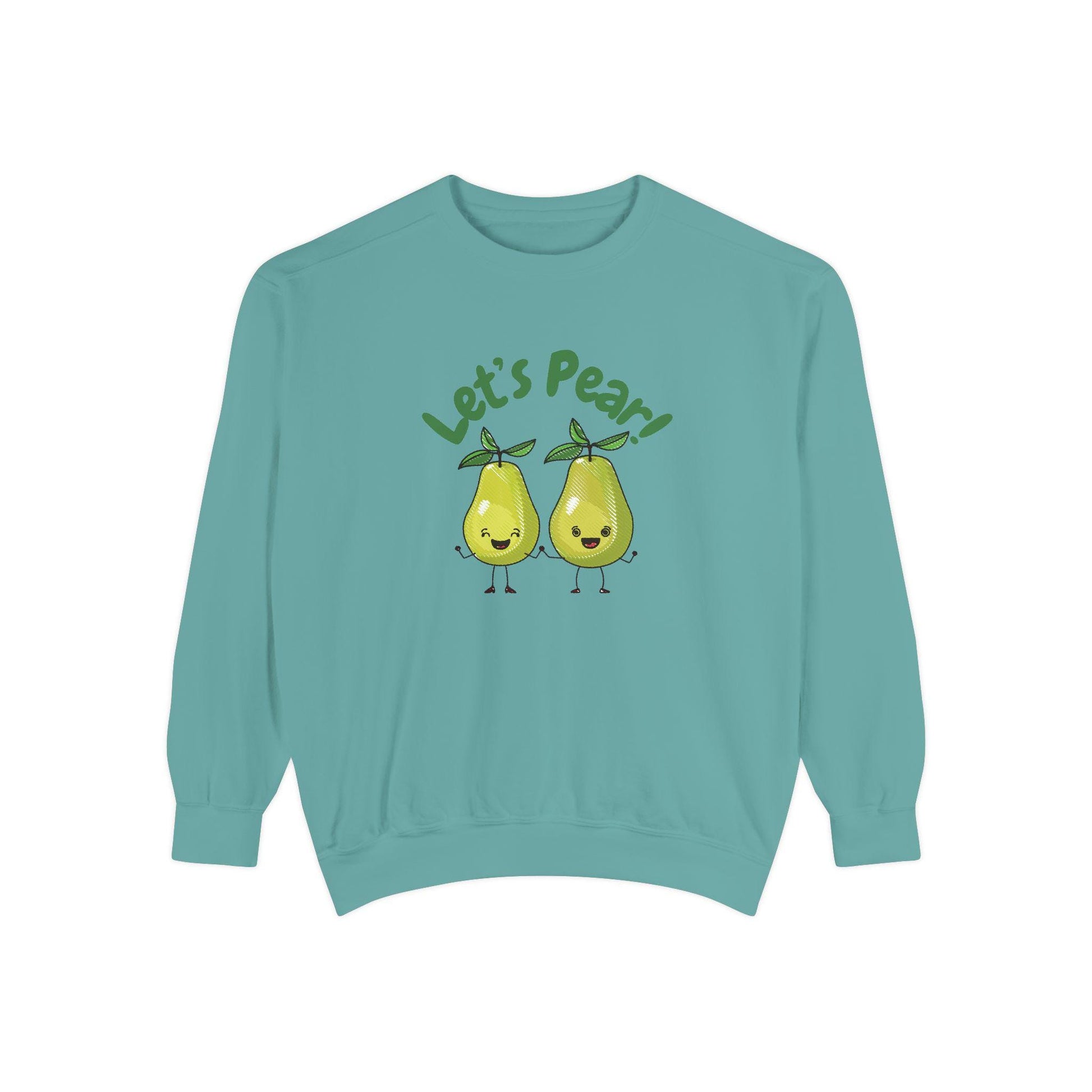Cozy RBT "Let's Pear" sweatshirt featuring two smiling pears holding hands. A cute and fun design for Registered Behavior Technicians who love spreading positivity and pairing with their learners. This unisex, garment-dyed sweatshirt is all about comfort and style. Made with 80% ring-spun cotton and 20% polyester. The fabric is 3-end garment-dyed, ring-spun, color-blast fleece with a 100% cotton face. Each sweatshirt comes with a relaxed fit, a rolled-forward shoulder, and a back neck patch.