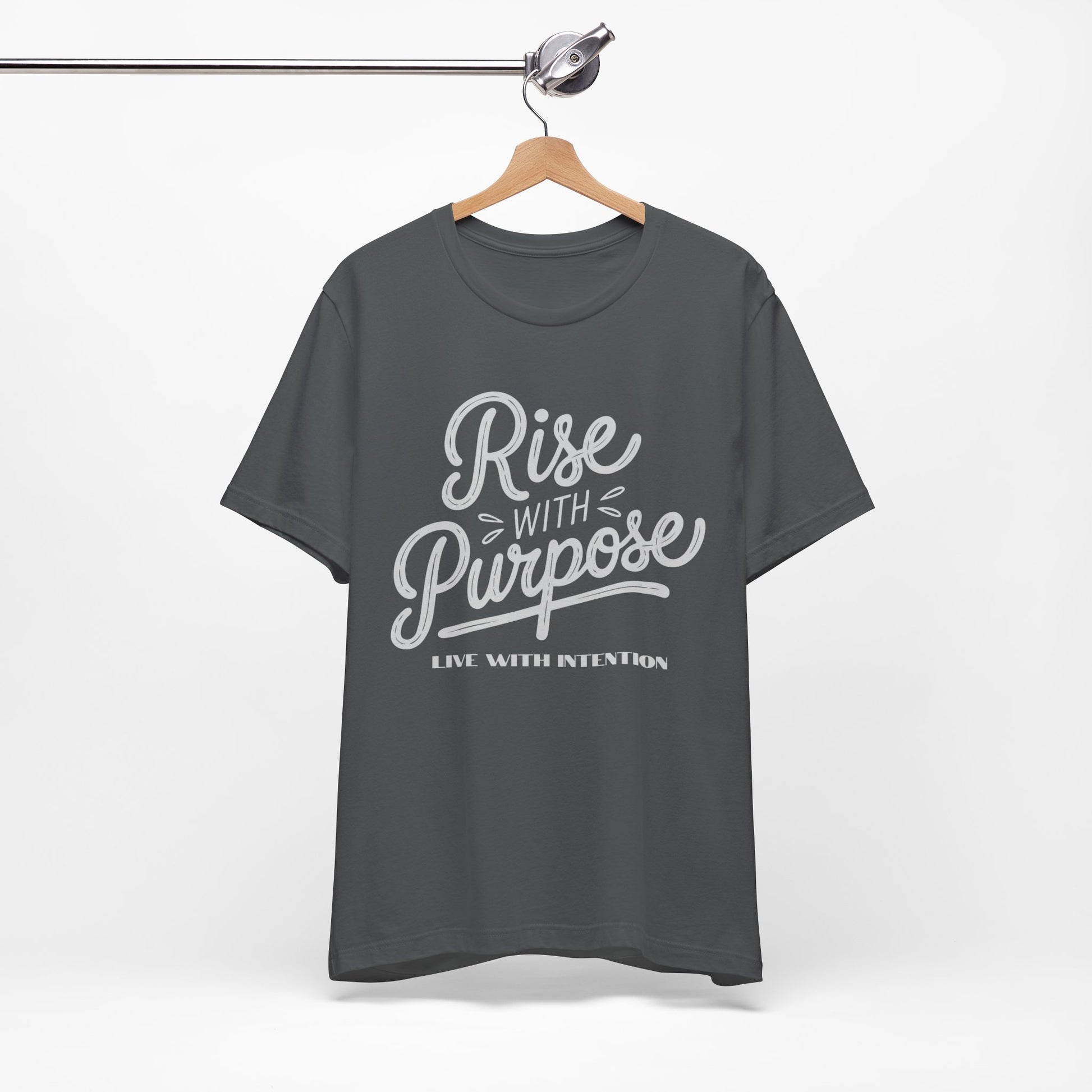 "Rise with Purpose and Live with Intention" Christian tee. It makes the perfect addition to your wardrobe or gift for the believer in your life. This classic jersey short sleeve tee fits like a well-loved favorite. Soft cotton and quality print make users fall in love with it over and over again. These t-shirts have-ribbed knit collars to bolster shaping. The shoulders are tapered for a better fit over time. Dual side seams hold the garment's shape for longer.