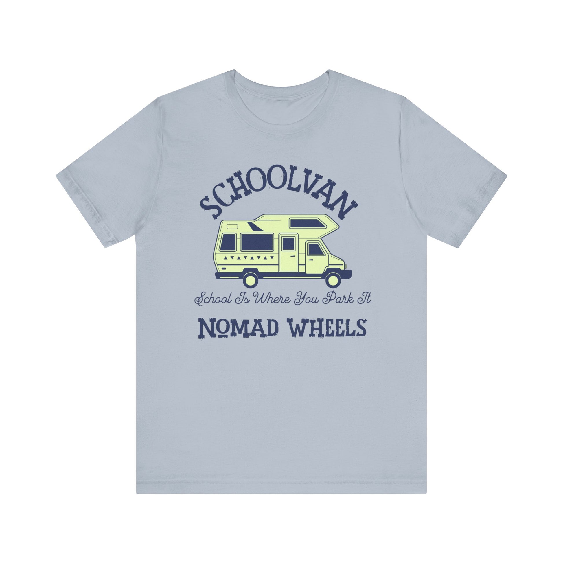 This comfy t-shirt is perfect for homeschool family on the road. It features an RV and the phrases "Schoolvan School is Where You Park It Nomad Wheels" This classic unisex jersey short sleeve tee fits like a well-loved favorite. Soft cotton and quality print make users fall in love with it over and over again. These t-shirts have-ribbed knit collars to bolster shaping. The shoulders are tapered for a better fit over time. Dual side seams hold the garment's shape for longer.