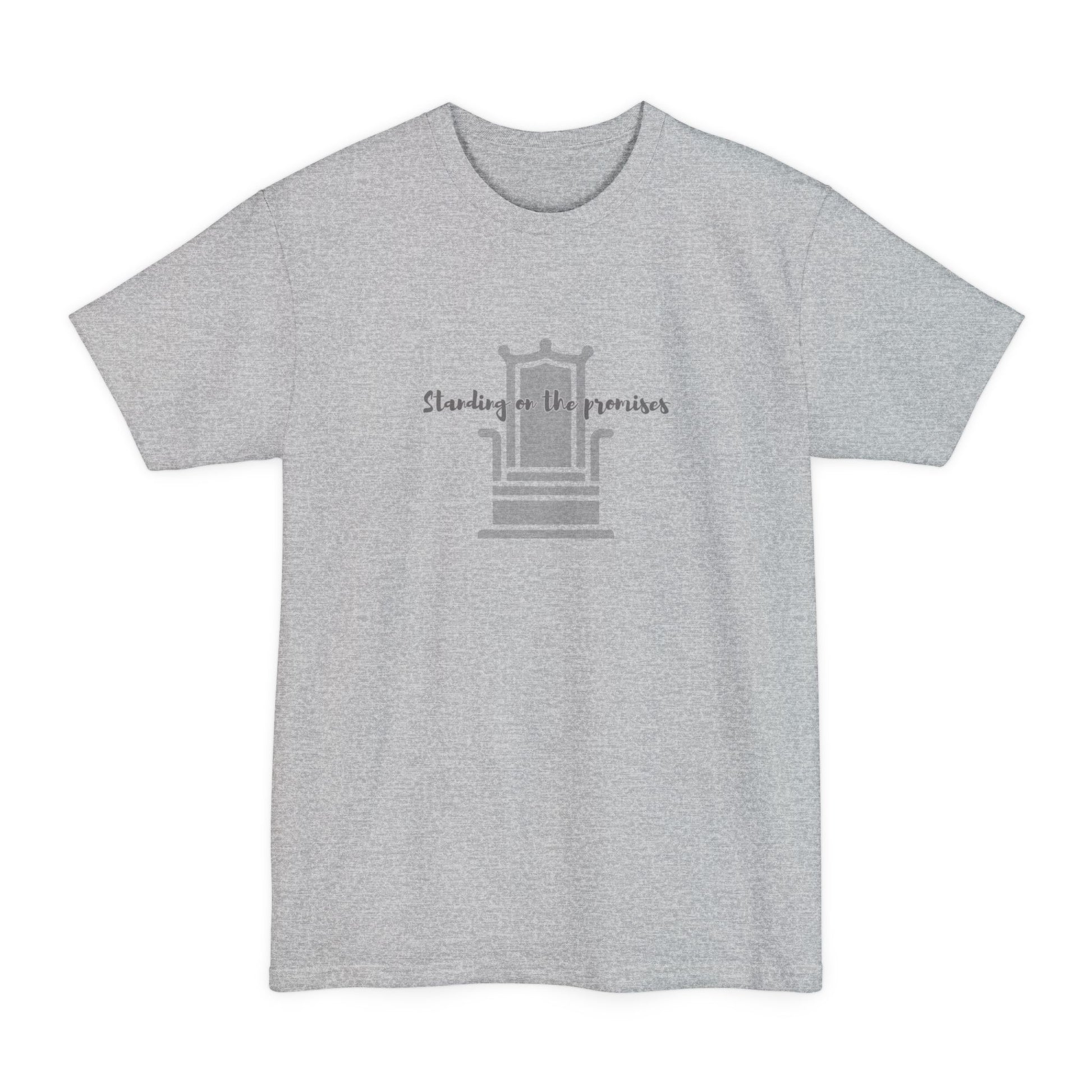 Faith and strength come together in this bold statement tee. Featuring the powerful message “Standing on the Promises, Kneeling at the Throne” with a throne design, this shirt is a daily reminder of unwavering trust in God’s promises and humble surrender at His throne. Printed on the Hanes Tall Beefy-T®, this shirt is three inches longer than the regular fit, offering the perfect balance of comfort and coverage for taller builds. The roomy cut, soft 100% cotton fabric, and tear-away label make it a go-to favorite for everyday wear or ministry outreach. Details Design: Standing on the Promises, Kneeling at the Throne with throne graphic Material: 100% cotton (fiber content may vary by color) Fabric Weight: Medium (6.1 oz/yd²) Fit: Full cut, roomy fit Length: 3" longer than standard tees Label: Tear-away for comfort Sizes: LT (Large Tall) to 4XLT Why You’ll Love It This tee isn’t just clothing—it’s a testimony. Wear it as a personal reminder, a conversation starter, or a way to share your faith boldly. Perfect for church, outreach, or everyday casual style.