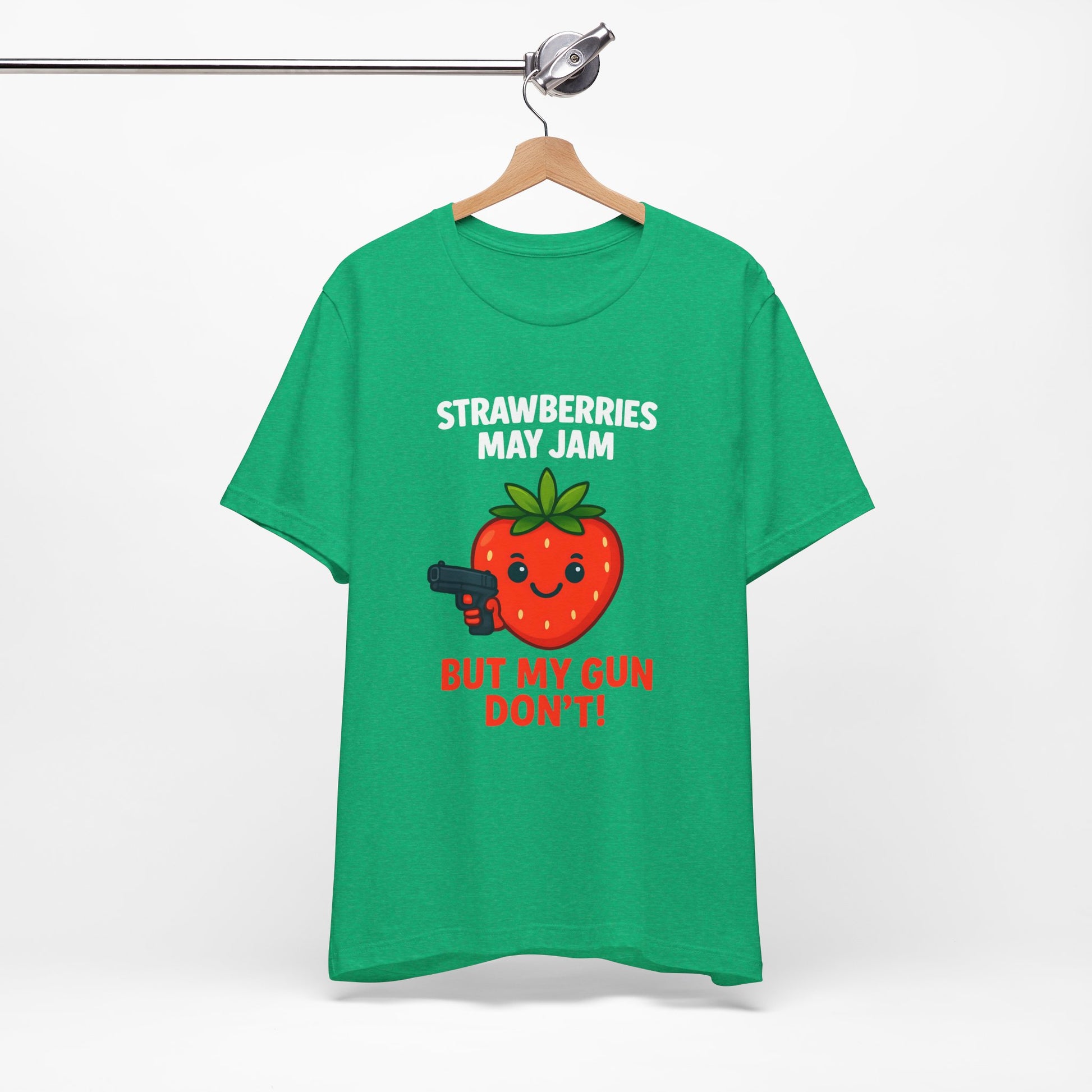 This whimsical strawberry cartoon tee is perfect for the gun enthusiast in your life. It features the phrase "Strawberries May Jam, But My Gun Don't". This classic jersey short sleeve tee fits like a well-loved favorite. Soft cotton and quality print make users fall in love with it over and over again. These t-shirts have-ribbed knit collars to bolster shaping. The shoulders are tapered for a better fit over time. Dual side seams hold the garment's shape for longer.