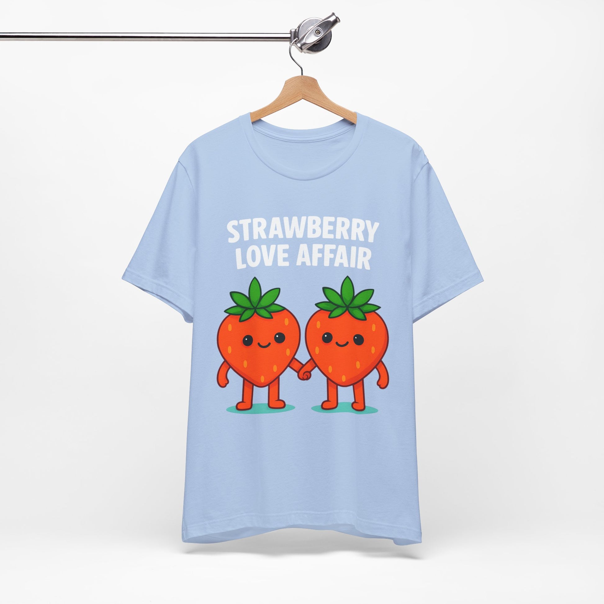 Whimsical cartoon tee featuring a couple of strawberries holding hands with the pharse "Strawberry Love Affair." It's the perfect gift for the gardener in your life. This classic jersey short sleeve tee fits like a well-loved favorite. Soft cotton and quality print make users fall in love with it over and over again. These t-shirts have-ribbed knit collars to bolster shaping. The shoulders are tapered for a better fit over time. Dual side seams hold the garment's shape for longer.