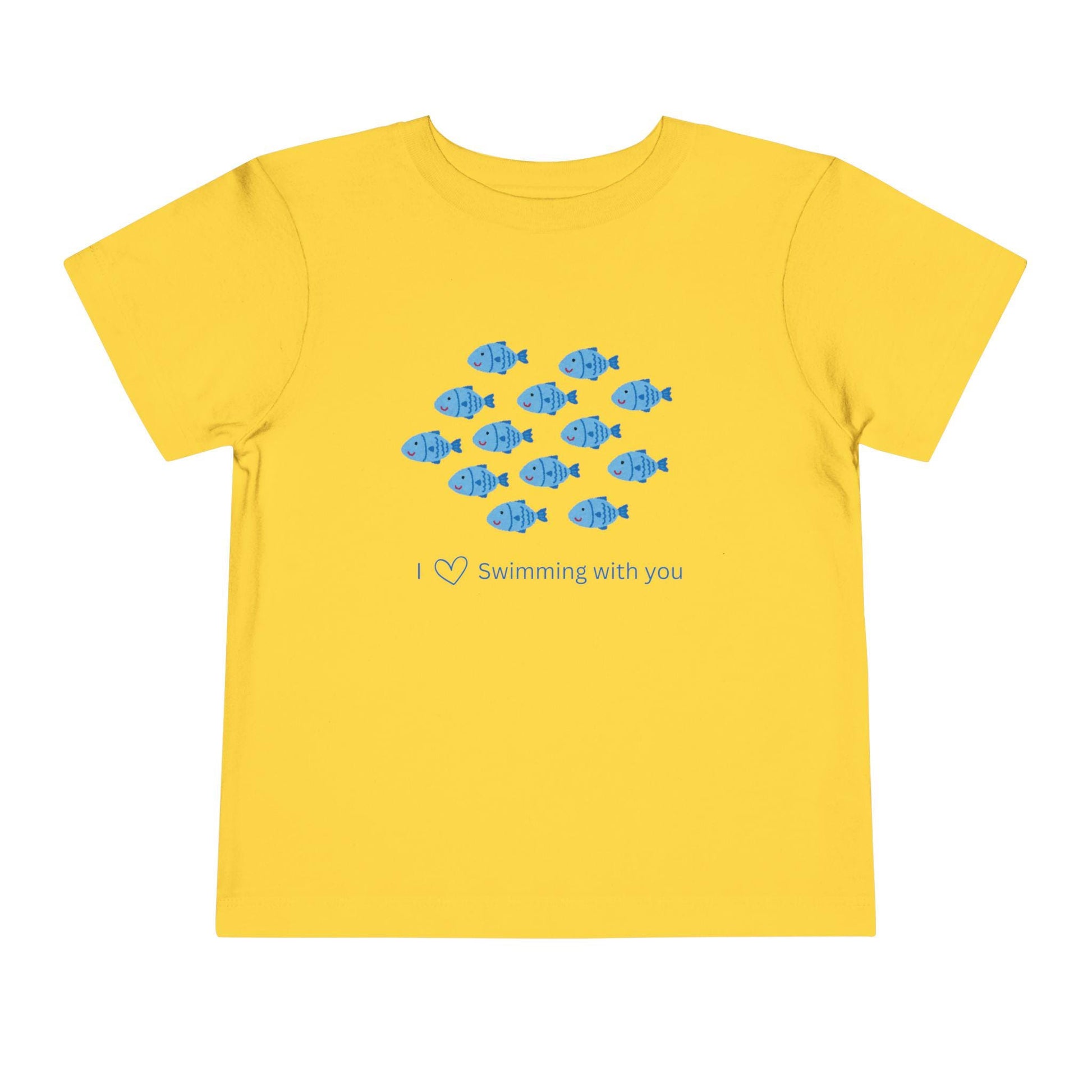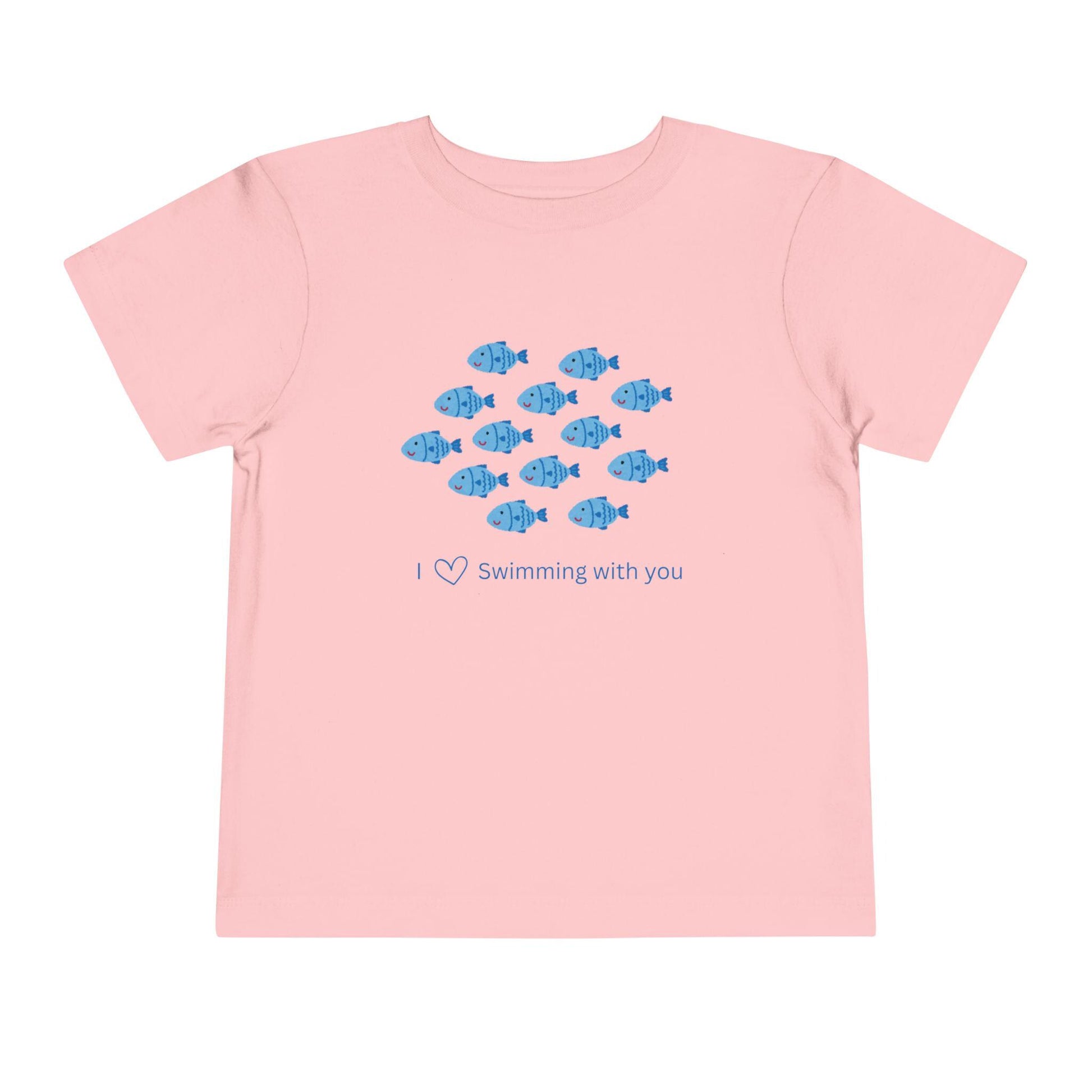 An adorable addition to any child's wardrobe, this I love swimming with you tee featuring a school of colorful fish is sure to bring smiles. The Bella Canvas short sleeve tee for toddlers is a 100% Airlume combed and ring-spun cotton jersey with a tear-away label for extra comfort. Choose your favorite color out of a big variety, and make unique staples that toddlers will happily wear every day.