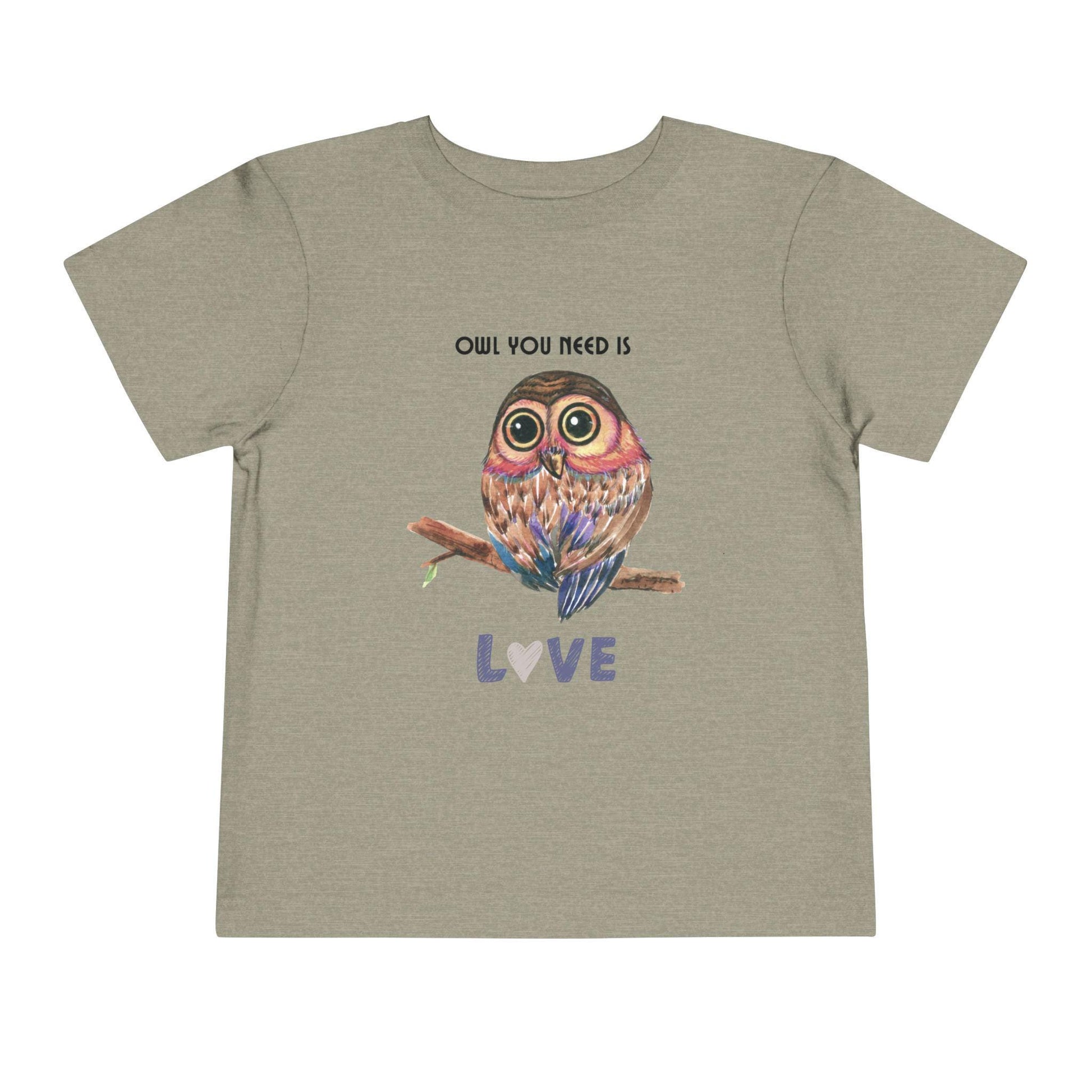 Adorable "Owl You Need is Love" toddler tee. Uplift any child's wardrobe with this multi-color owl custom kid's t-shirt. Sweet and whimsical, it's the perfect gift for the little one in your life. The Bella Canvas short sleeve tee for toddlers is a 100% Airlume combed and ring-spun cotton jersey with a tear-away label for extra comfort. Choose your favorite color out of a big variety, and make unique staples that toddlers will happily wear every day.