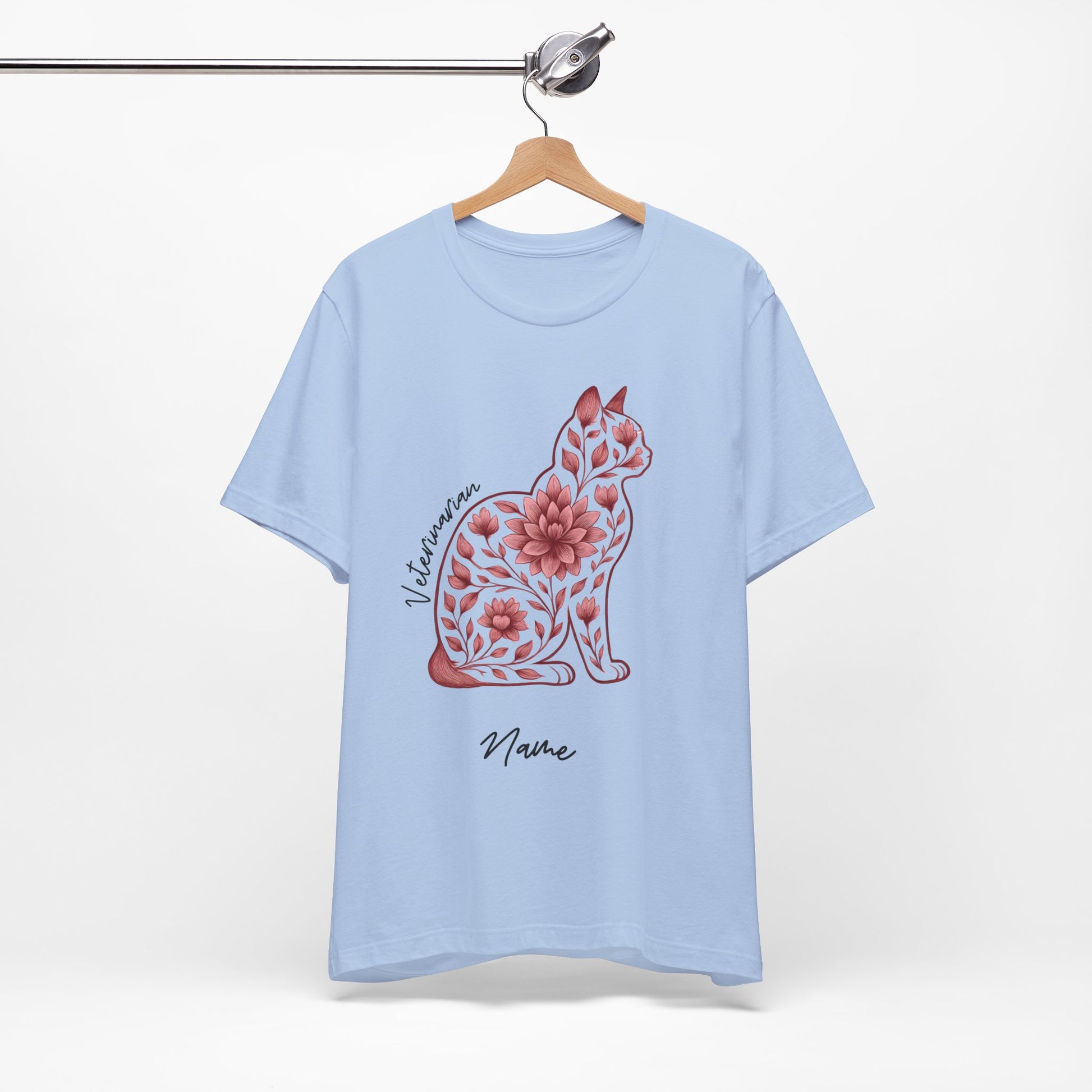 Beautiful cat floral pattern shirt for veterinarians. Personalize with your name. Makes the perfect gifts for your favorite vet. This classic jersey short sleeve tee fits like a well-loved favorite. Soft cotton and quality print make users fall in love with it over and over again. These t-shirts have-ribbed knit collars to bolster shaping. The shoulders are tapered for a better fit over time. Dual side seams hold the garment's shape for longer.
