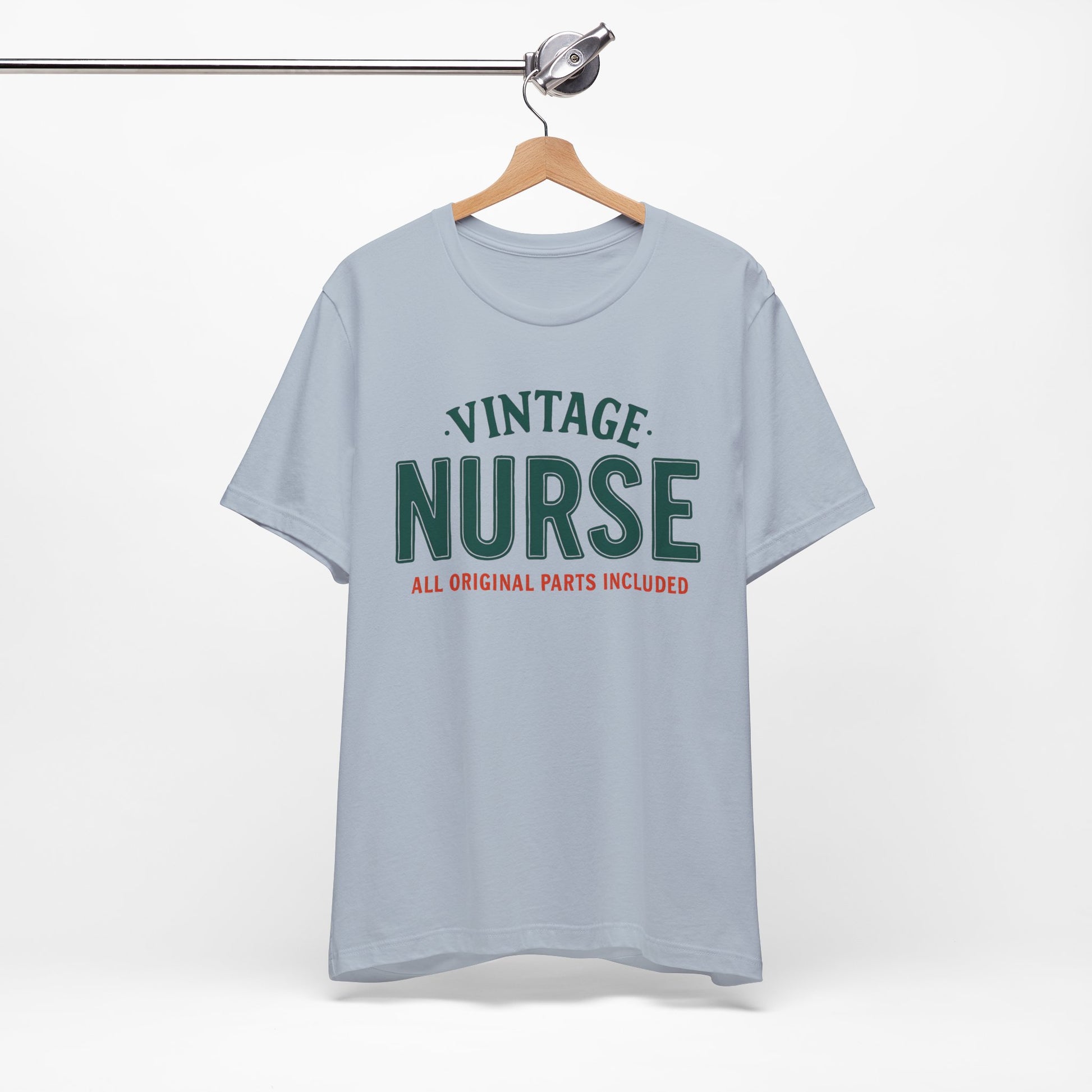 This vintage nurse tee is perfect for the seasoned nurse in your life. It features a vintage block letters, and promises "All original parts are included". This classic unisex jersey short sleeve tee fits like a well-loved favorite. Soft cotton and quality print make users fall in love with it over and over again. These t-shirts have-ribbed knit collars to bolster shaping. The shoulders are tapered for a better fit over time. Dual side seams hold the garment's shape for longer.