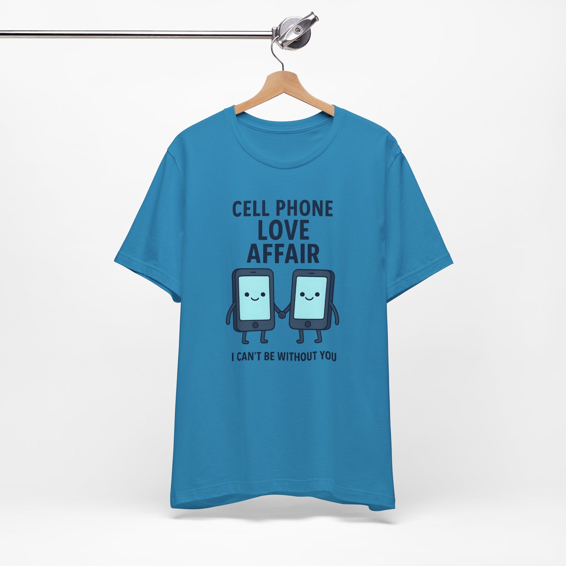 This quirky tee if for the person in your life that loves their cell phone. The shirt features two smart phones holding hands, with the words say "Cell Phone Love Affair...I can't live without you."