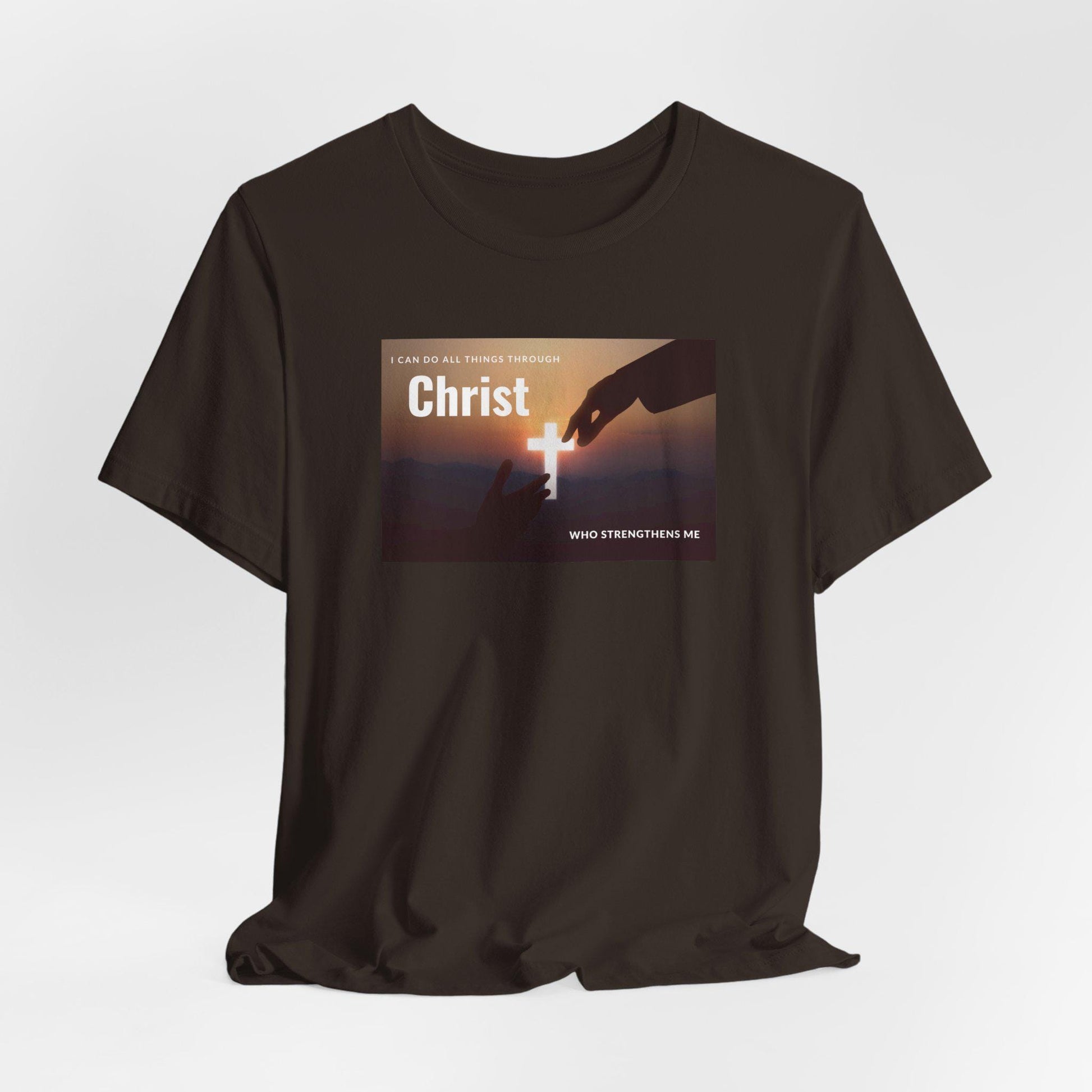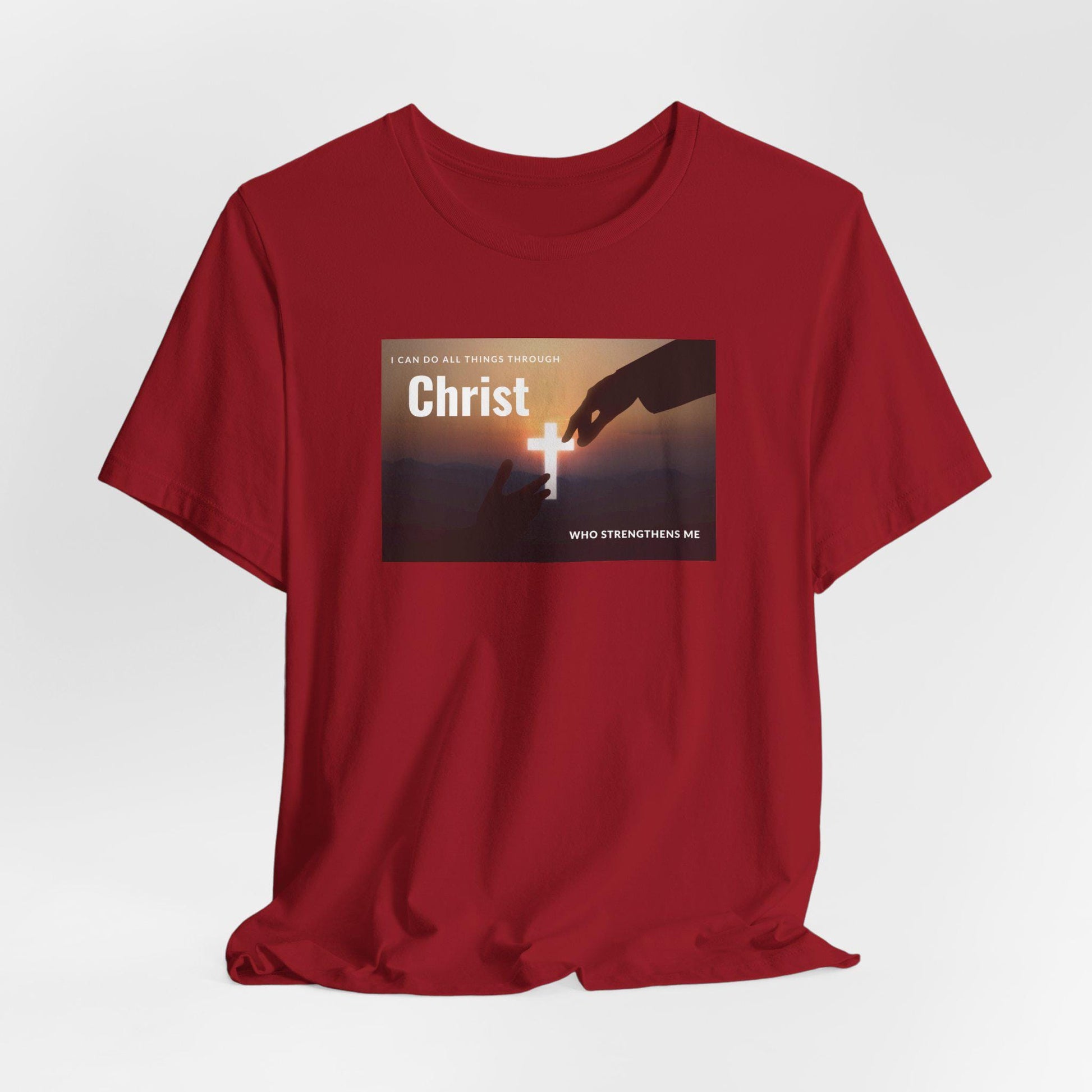 Feel the peace and serenity of this "Christ Who Strengthens Me" Christian tee. Featuring hands reaching for a beautiful cross of light between them. Perfect for yourself or the believer in your life. This classic unisex jersey short sleeve tee fits like a well-loved favorite. Soft cotton and quality print make users fall in love with it over and over again. These t-shirts have-ribbed knit collars to bolster shaping. The shoulders are tapered for a better fit over time. Dual side seams hold the garment's shape for longer.