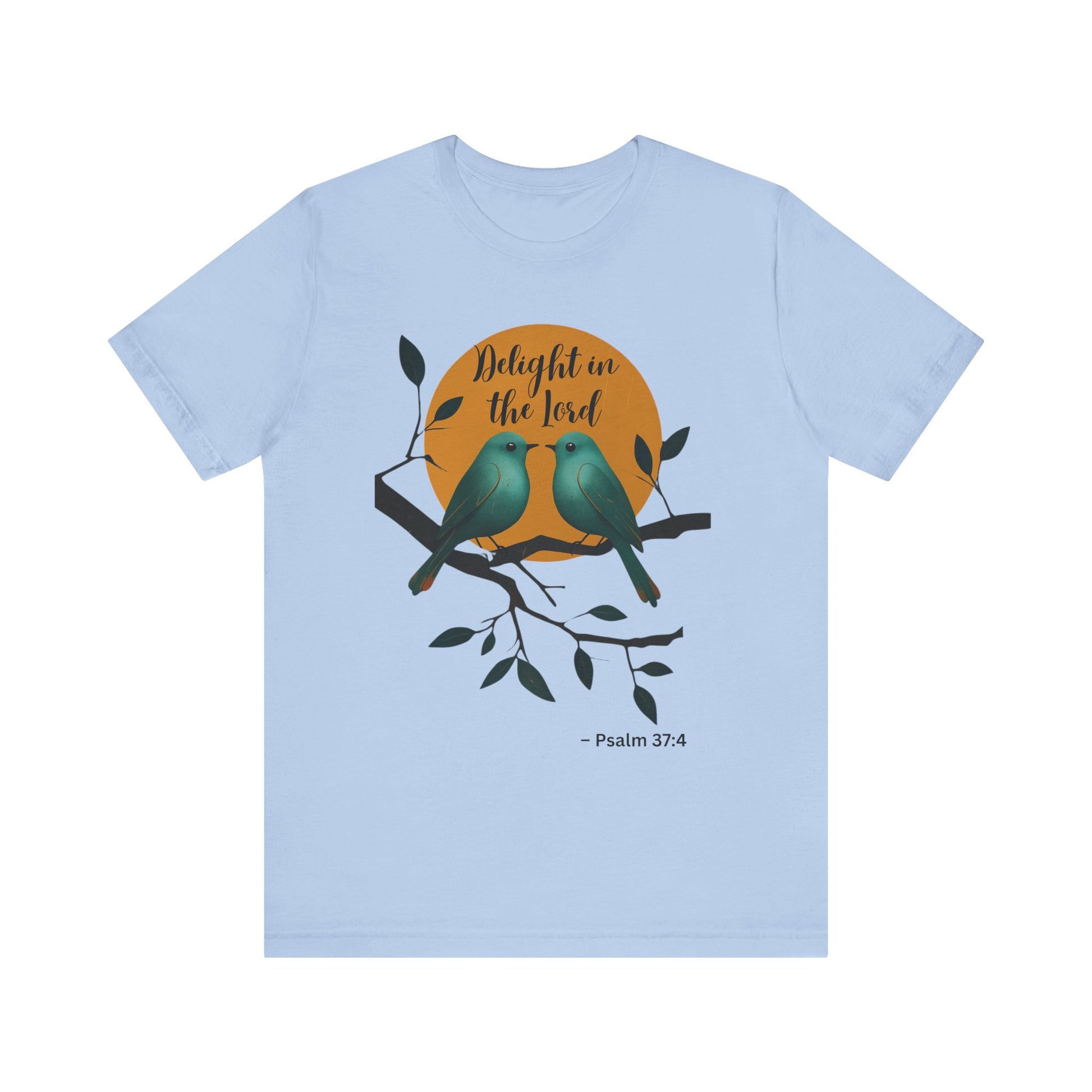 The beautiful Christian tee reminds us that God's finger prints are everywhere, and joy can be found in the simplest of things. The shirt features two happy blue birds enjoying the sunset pared with the verse "Delight in the Lord -Psalm 37.4". This classic jersey short sleeve tee fits like a well-loved favorite. Soft cotton and quality print make users fall in love with it over and over again. These t-shirts have-ribbed knit collars to bolster shaping. The shoulders are tapered for a better fit over time. Dual side seams hold the garment's shape for longer. .: Made with 100% Airlume combed and ring-spun cotton, a lightweight fabric (4.2 oz/yd² (142 g/m²)) that is easy to layer, breathable. Perfect for active and leisure wear. .: The retail fit that is perfect for casual and semi-formal settings. The crew neckline adds a classic, neat style that's perfect for accessorizing. .: Bella+Canvas manufactures all its products in the US and internationally in humane, no-sweat-shop, sustainable way and is part of the Fair Labor Association as well as Platinum WRAP certified. .: The tear-away label minimizes skin irritations. .: Fabric blends: Ash and Heather Prism colors - 99% cotton, 1% polyester; Heather and Solid Blend colors - 52% cotton, 48% polyester; Athletic Heather and Black Heather - 90% cotton, 10% polyester.
