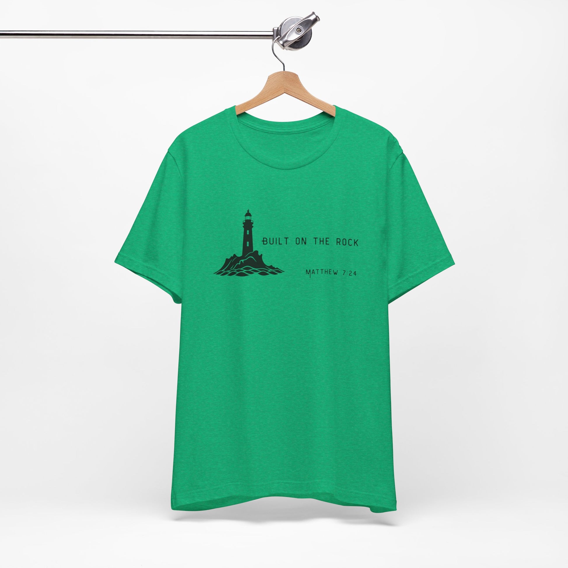 This simple Christian tee features the silhouette of a light house and the bible verse Matthew 7:24 "Built on the Rock" It makes the perfect gift for yourself or the believer in your life. This classic jersey short sleeve tee fits like a well-loved favorite. Soft cotton and quality print make users fall in love with it over and over again. These t-shirts have-ribbed knit collars to bolster shaping. The shoulders are tapered for a better fit over time. Dual side seams hold the garment's shape for longer.