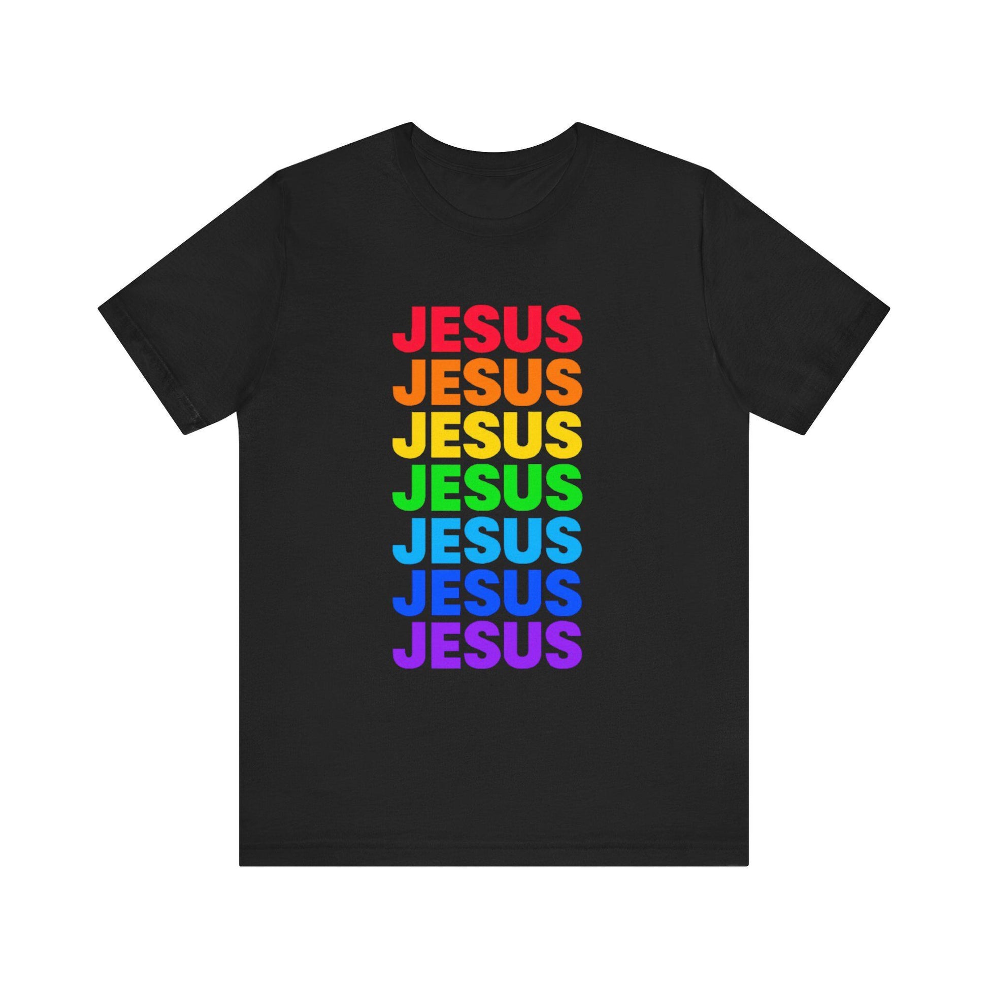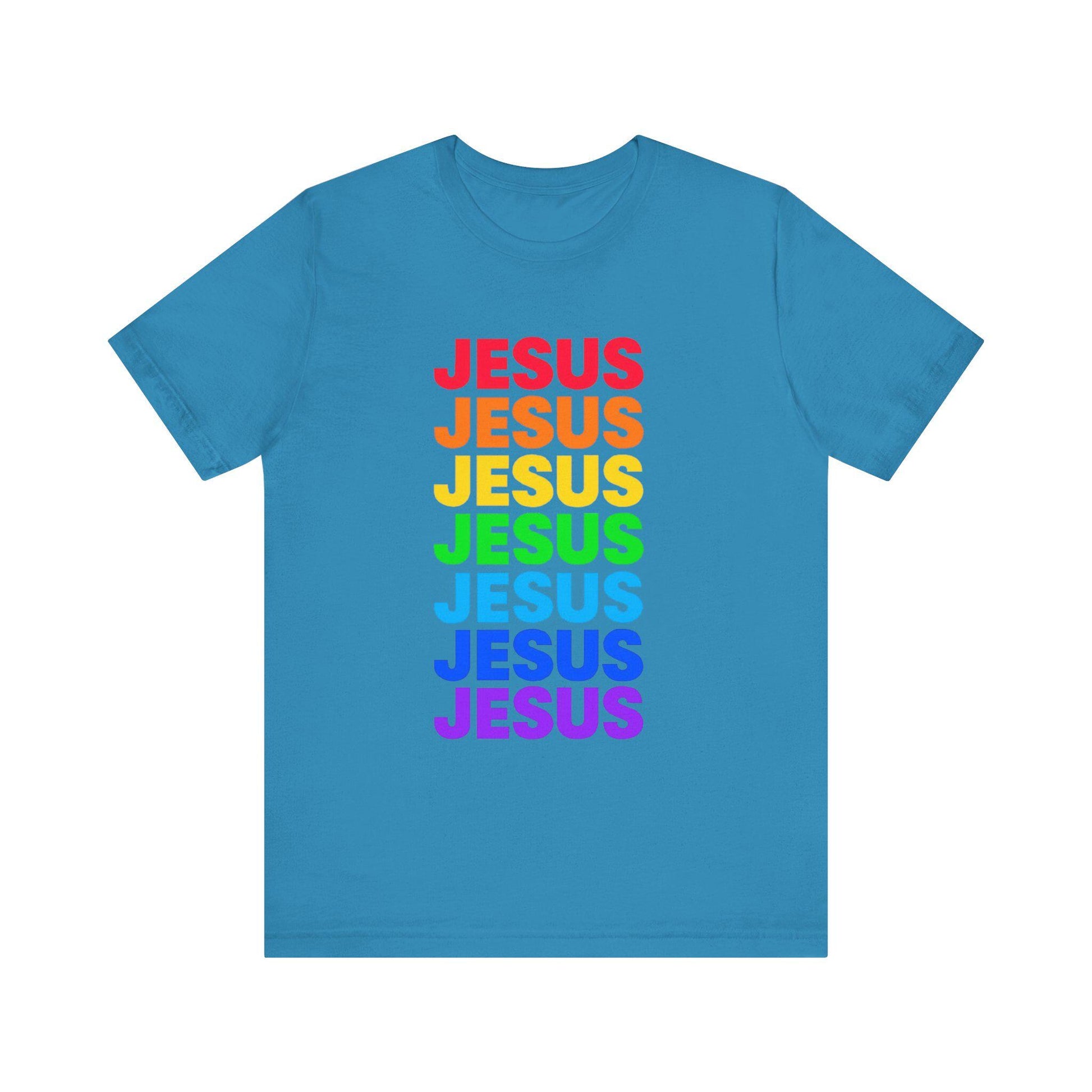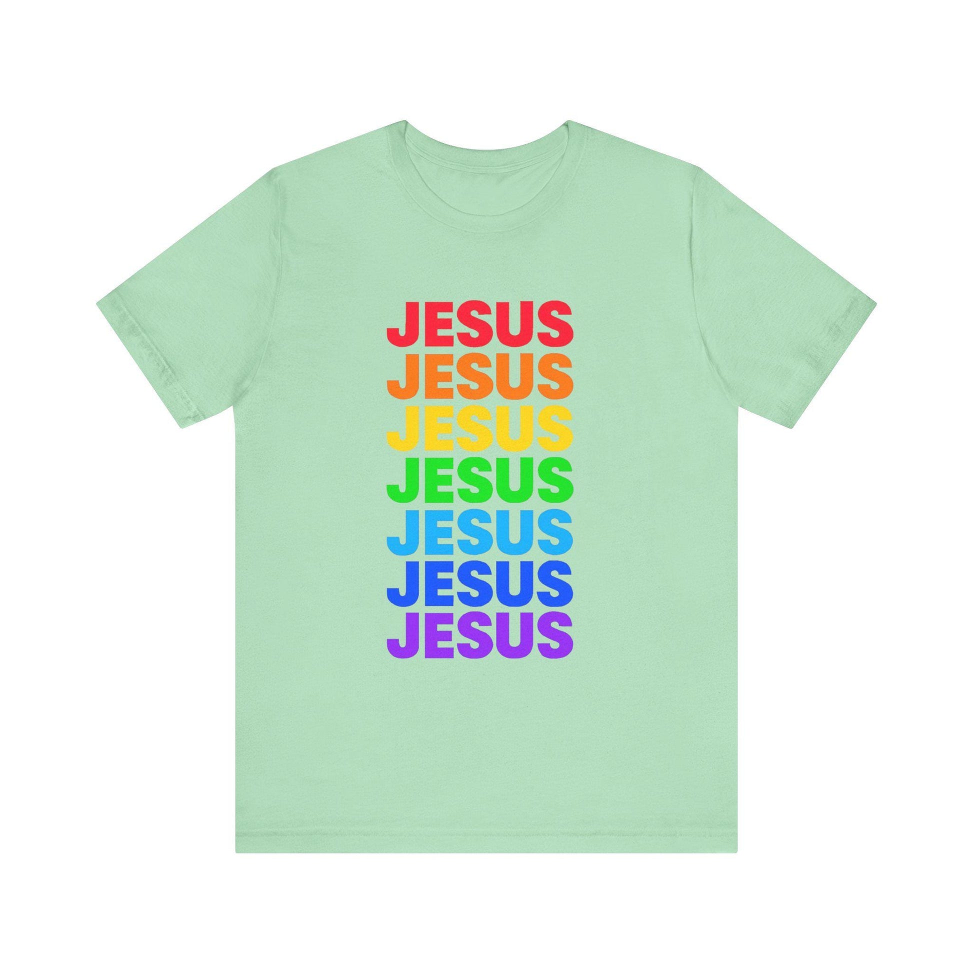 Show the world your love for the Lord with the colorful tee. The t-shirt features the name Jesus written multiple times in bright rainbow writing. This classic unisex jersey short sleeve tee fits like a well-loved favorite. Soft cotton and quality print make users fall in love with it over and over again. These t-shirts have-ribbed knit collars to bolster shaping. The shoulders are tapered for a better fit over time. Dual side seams hold the garment's shape for longer.