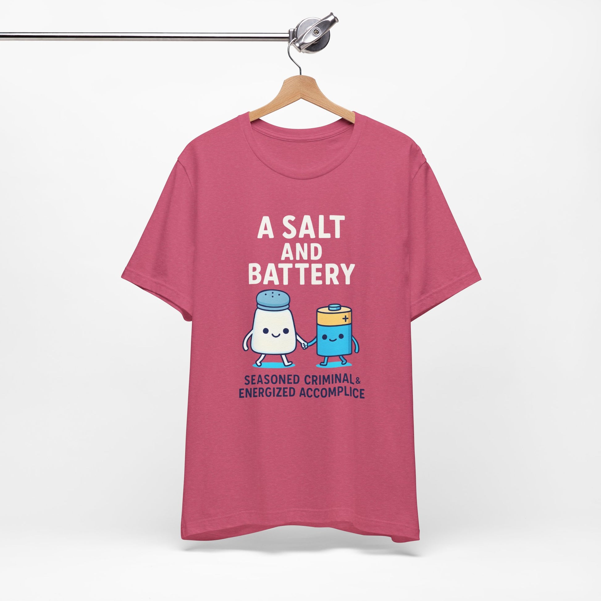 This quirky tee is perfect for the pun lover in your life. This tee features a salt shaker and battery holding hands, and the words "A salt and battery...A seasoned criminal and energized accomplice." This classic unisex jersey short sleeve tee fits like a well-loved favorite. Soft cotton and quality print make users fall in love with it over and over again. These t-shirts have-ribbed knit collars to bolster shaping. The shoulders are tapered for a better fit over time. Dual side seams hold the garment's shape for longer.