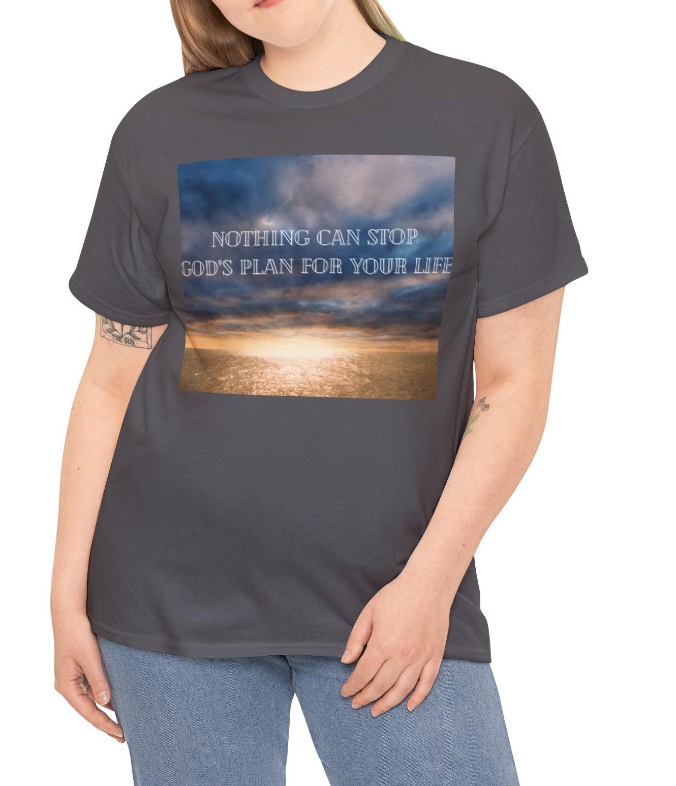 This "Nothing Can Stop God's Plan for Your Life" heavy cotton tee features a striking sky and sun shining over the water. Available in 8 colors and 8 sizes. The specially spun fibers provide a smooth surface for premium printing vividity and sharpness. No side seams mean there are no itchy interruptions under the arms. The shoulders have tape for improved durability.