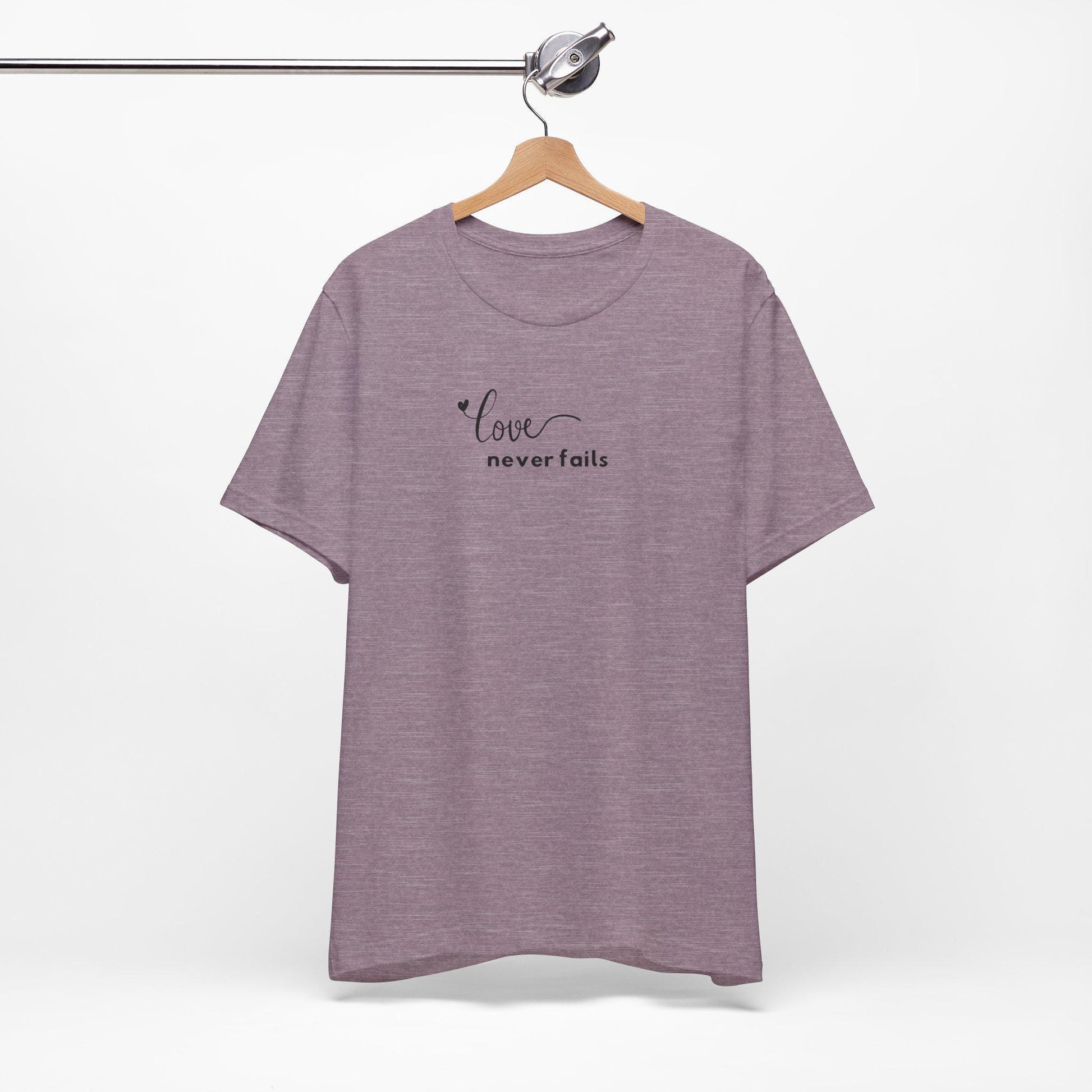 Wear your heart on your sleeve, or rather chest, with this women's "Love Never Fails" tee. The perfect gift for yourself or the romantic in your life. This classic unisex jersey short sleeve tee fits like a well-loved favorite. Soft cotton and quality print make users fall in love with it over and over again. These t-shirts have-ribbed knit collars to bolster shaping. The shoulders are tapered for a better fit over time. Dual side seams hold the garment's shape for longer.