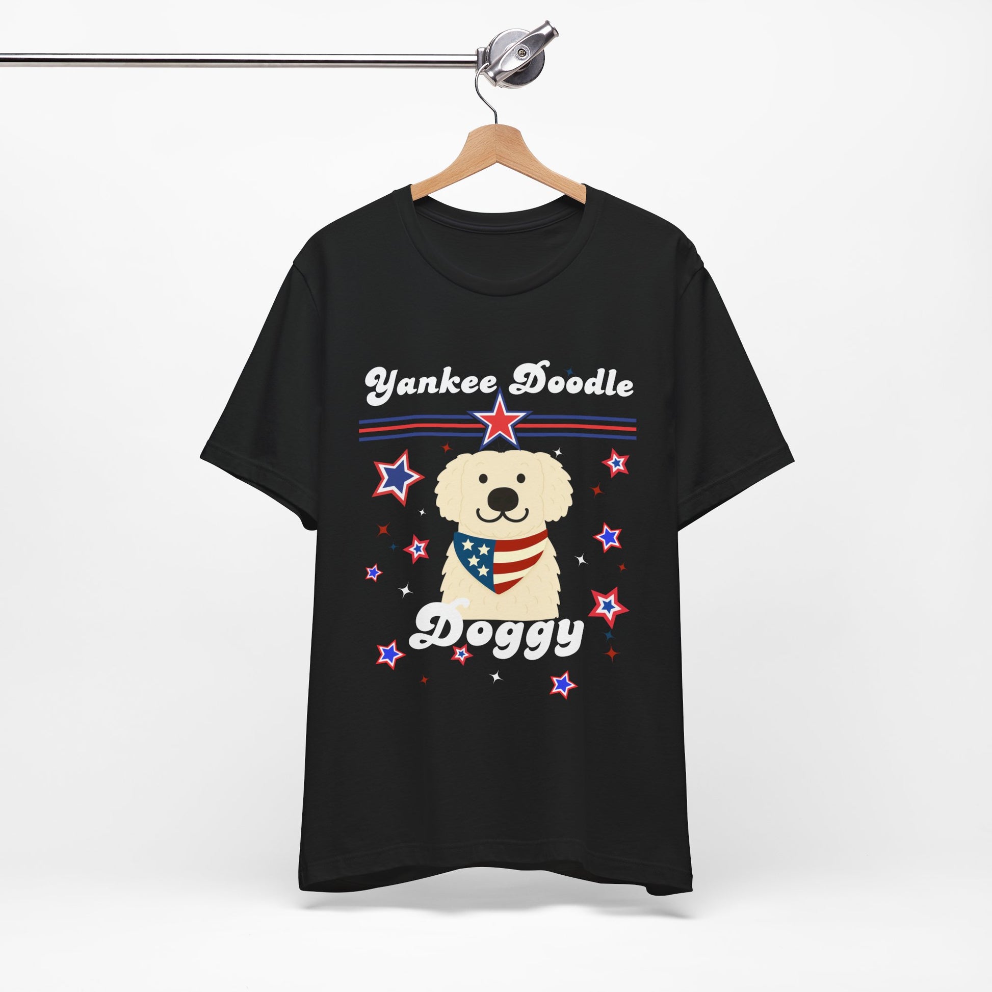 The perfect patriotic tee for pet lovers. The tee features a cartoon doddle with the words "Yankee Doodle Doggy" This tee features a light colored golden doodle wearing an American flag bandana.