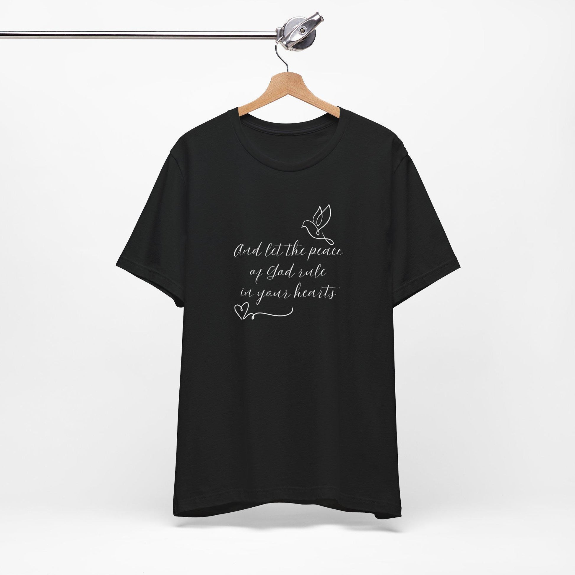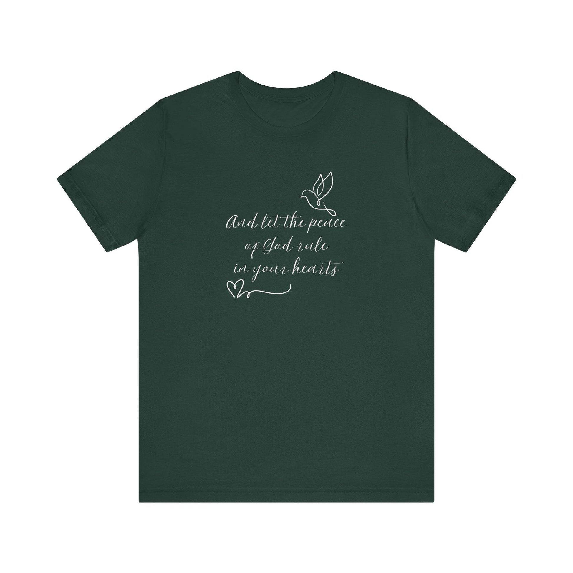This beautiful "Let the peace of God rule in your hearts" tee features a flying dove and heart. It fits like a well-loved favorite, and is perfect for the believer in your life. Soft cotton and quality print make users fall in love with it over and over again. These t-shirts have-ribbed knit collars to bolster shaping. The shoulders are tapered for a better fit over time. Dual side seams hold the garment's shape for longer.