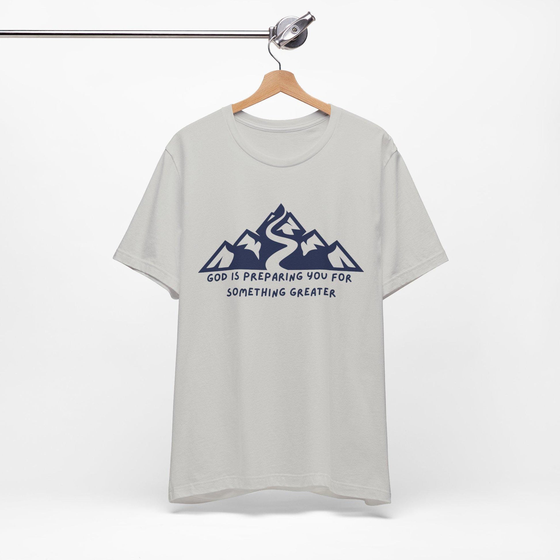 "God is Preparing You for Something Greater" classic jersey short sleeve tee fits like a well-loved favorite. Featuring a mountain path, this t-shirt is the perfect gift for yourself or the believer in your life. Soft cotton and quality print make users fall in love with it over and over again. These t-shirts have-ribbed knit collars to bolster shaping. The shoulders are tapered for a better fit over time. Dual side seams hold the garment's shape for longer.